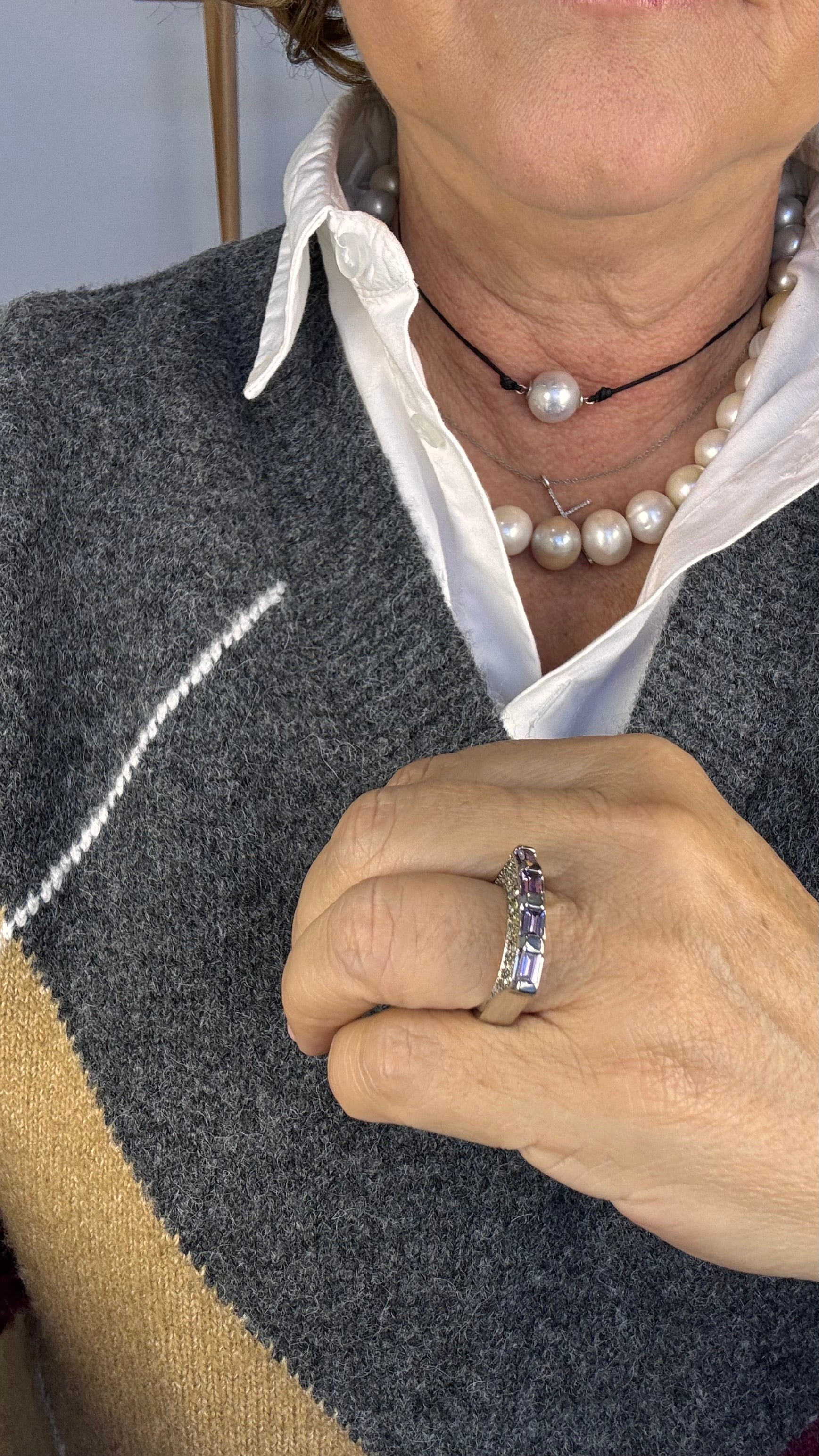 Rhodium-plated silver ring with cubic zirconia and amethysts, handmade by hand.