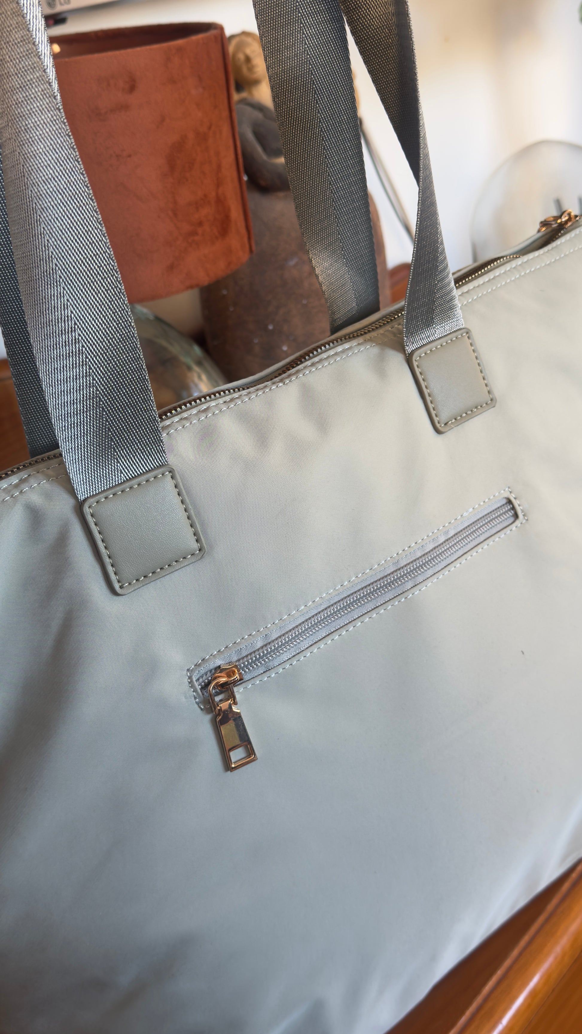 Bolso de nylon en color verde aguamarina, con cremallera para llevar cerrado. asas largas para colgar y más larga para cruzar .