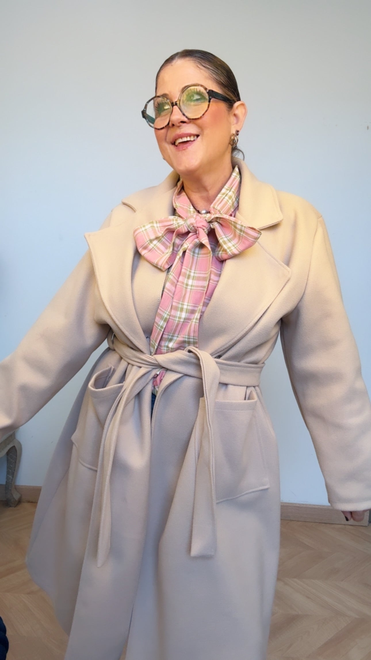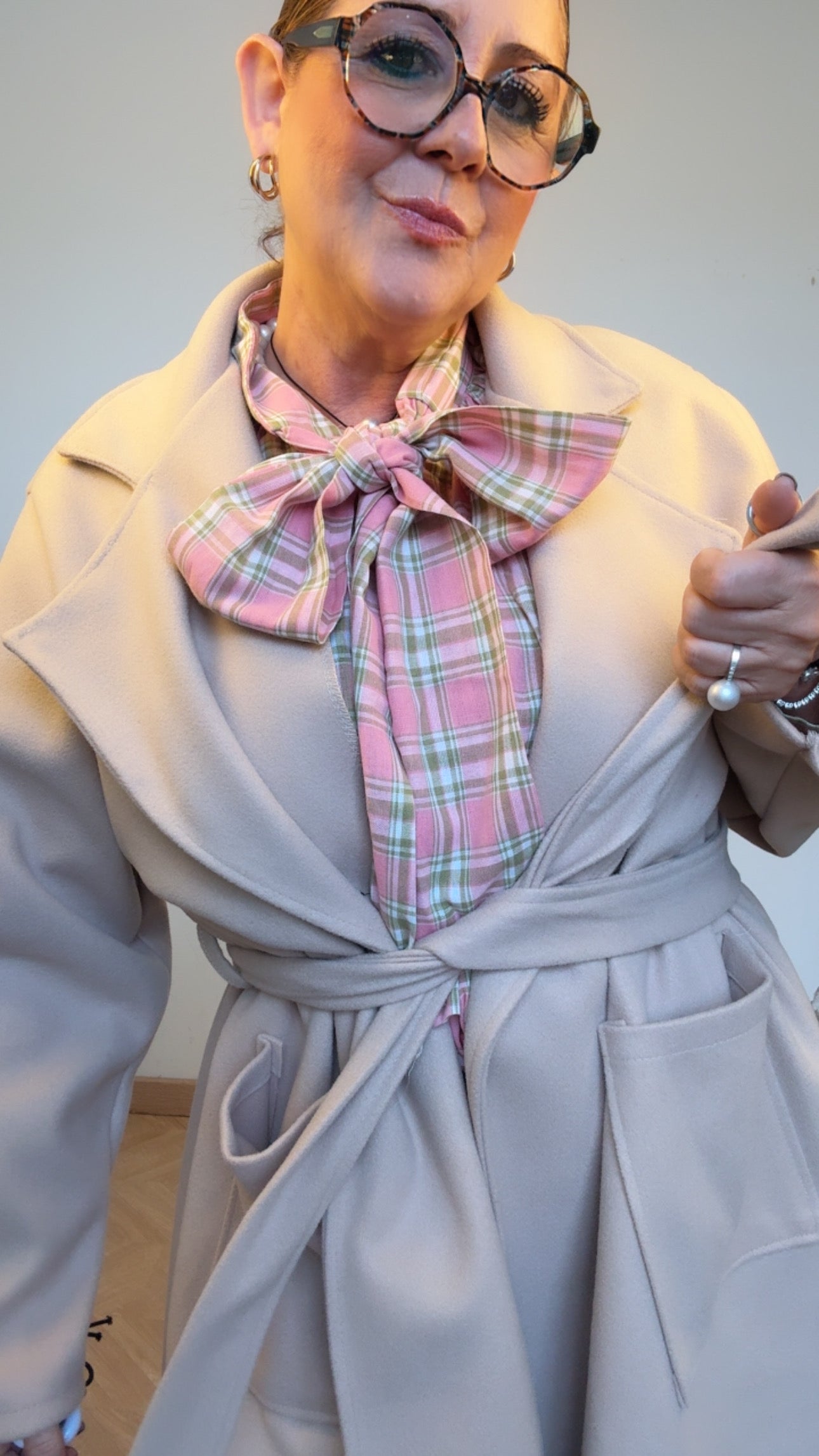 Camisa de lazada delantera en cuadrito dulce, con manga ranglan y plisadito en hombros.