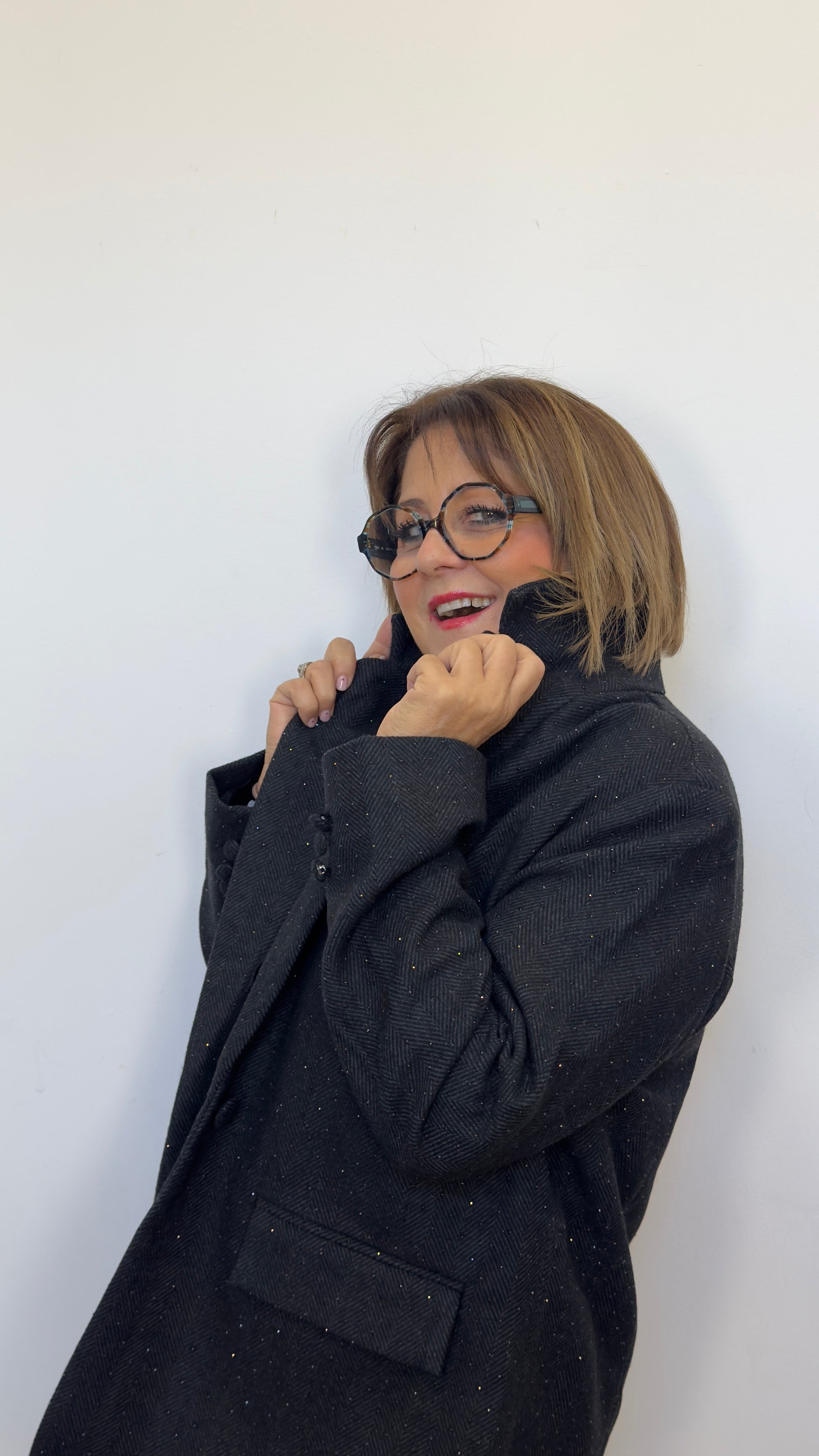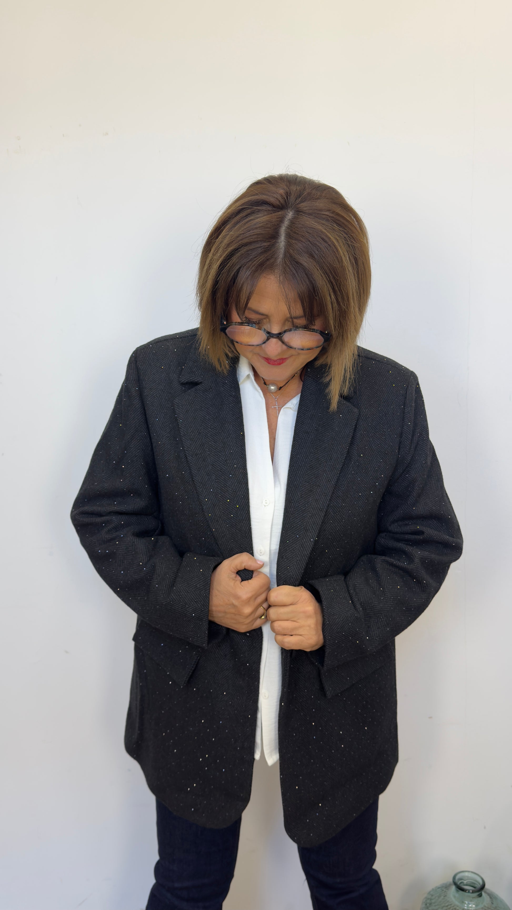The Janah blazer by Tiffosi redefines urban sophistication. Crafted from premium wool with a textured herringbone pattern and black metallic micro-studs, this piece combines understated elegance with a touch of sophistication for a flawless finish.