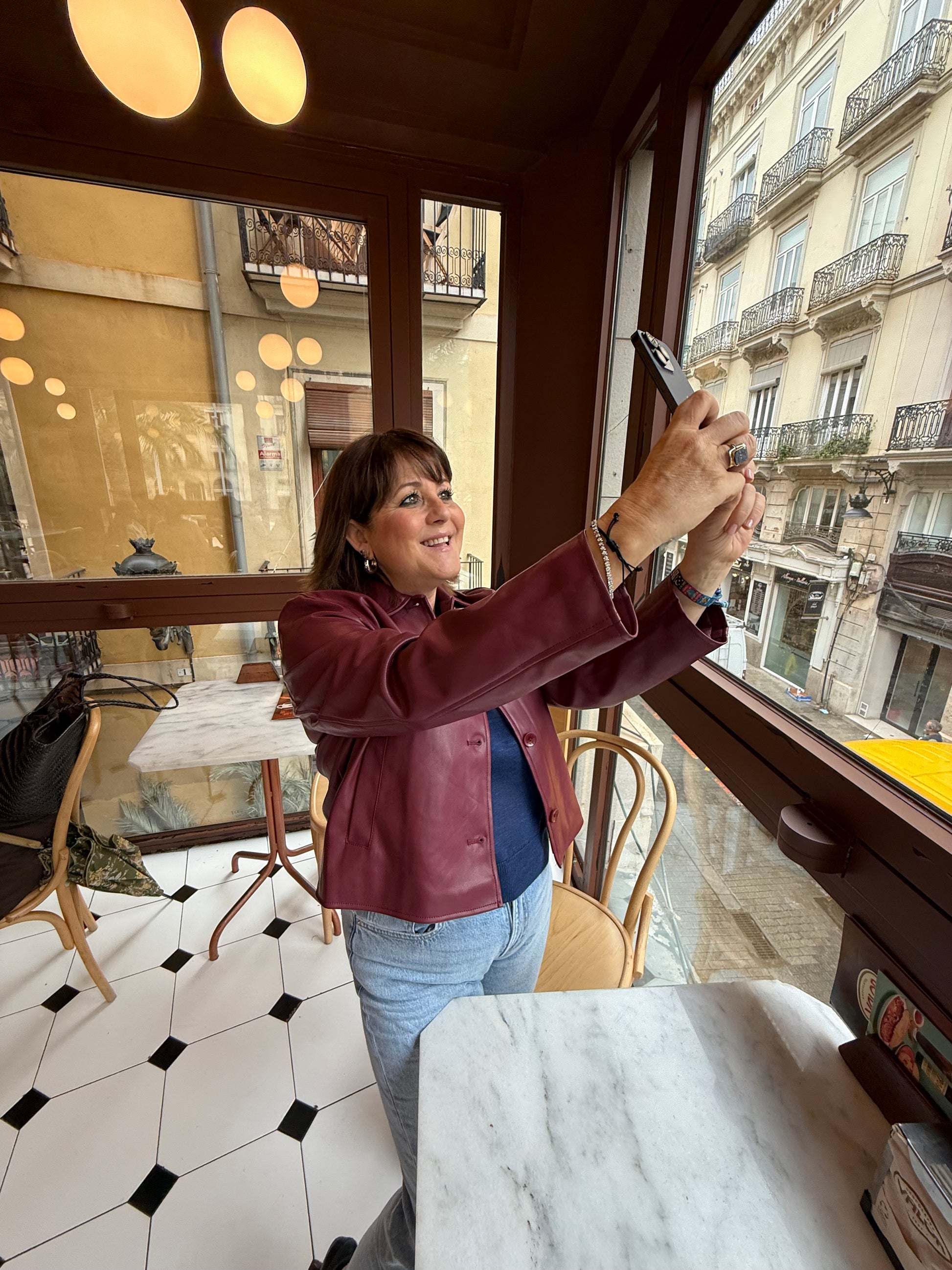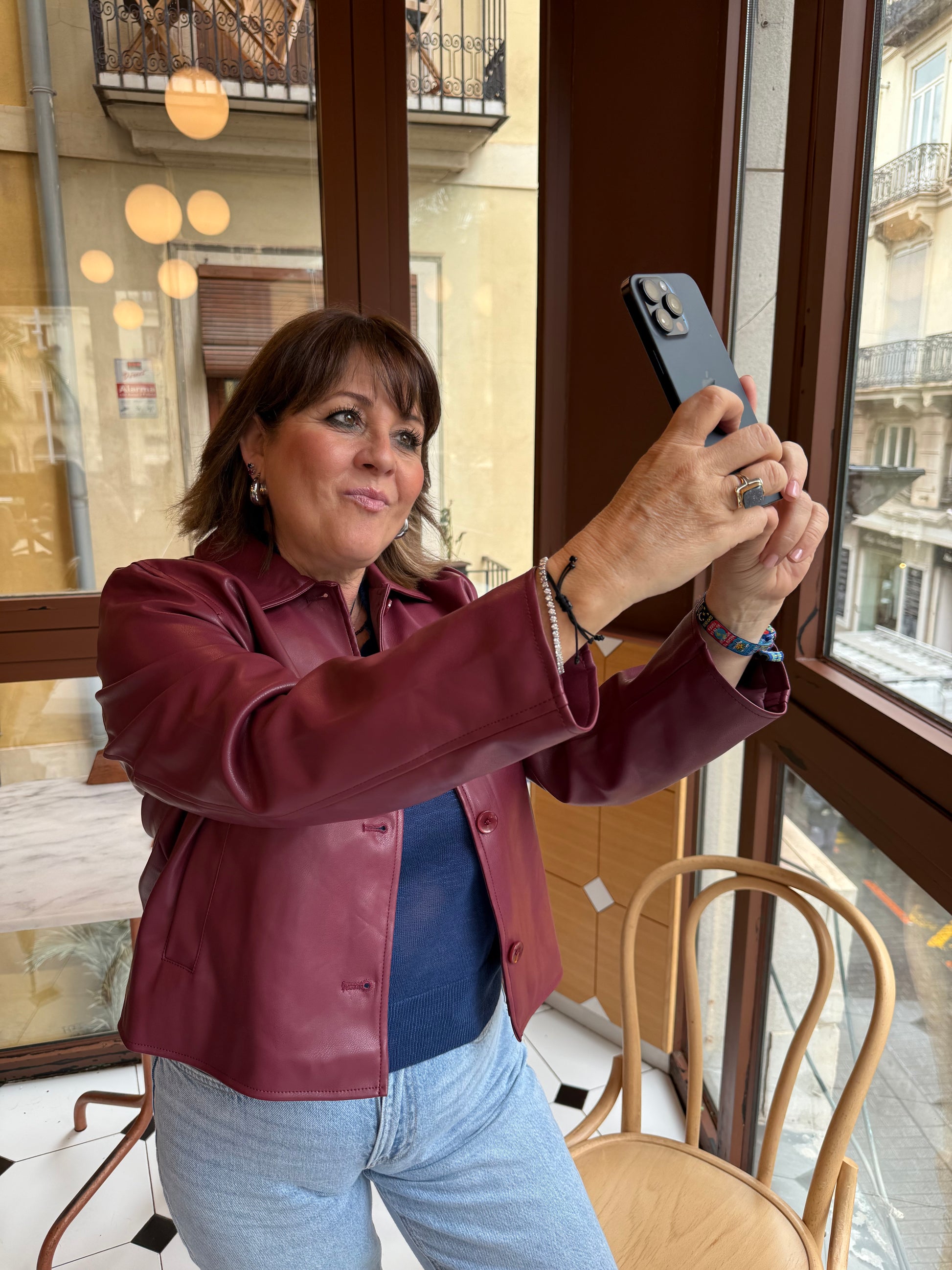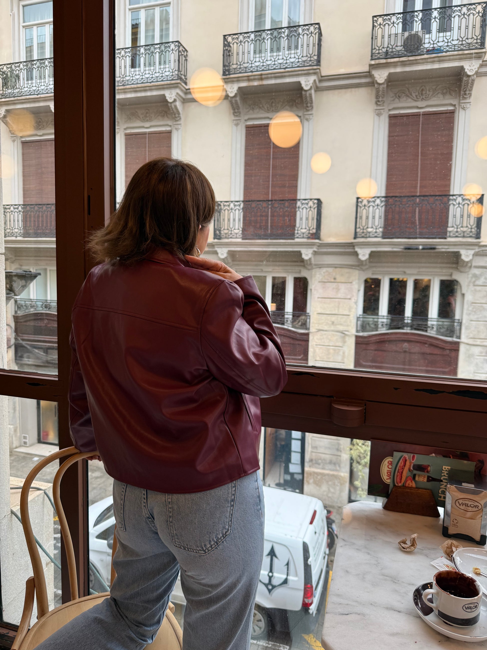Chaqueta de eco piel color cereza, con mangas abullonadas.