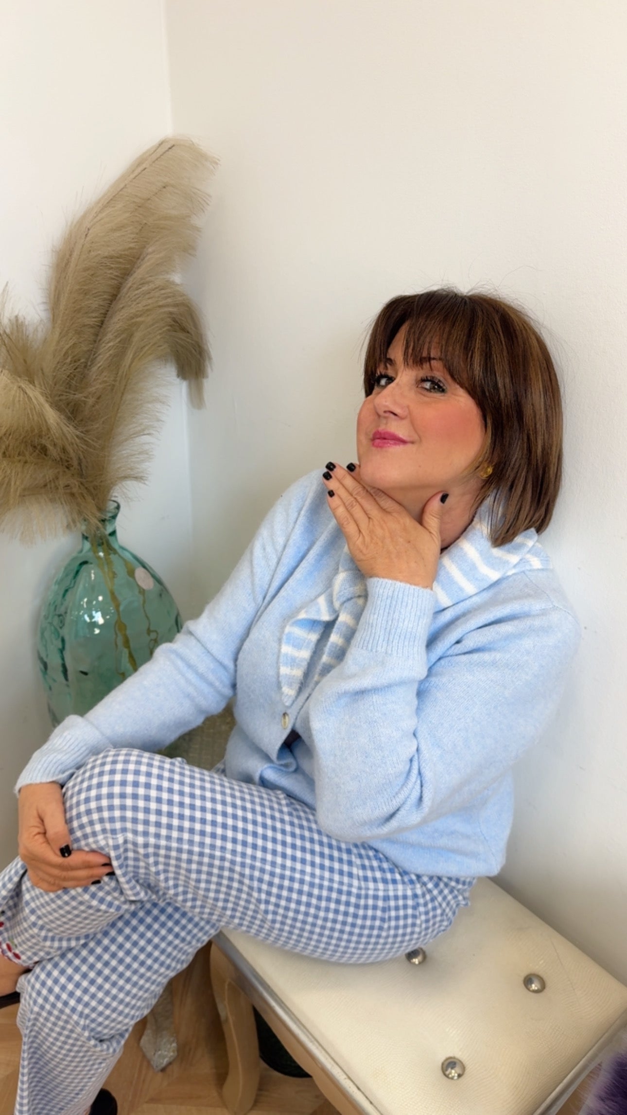 Chaqueta de punto azul bebé de cuello redondo con botones delanteros .y pañoleta de punto en forma de triángulo de rayas
