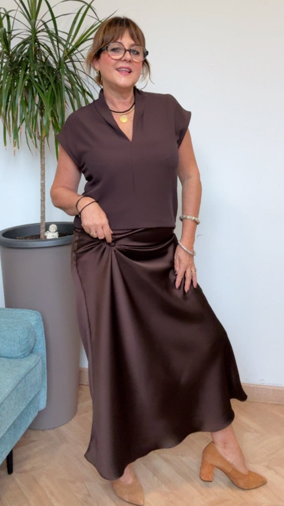 This stretch crepe shirt is not tight, does not leave marks and looks luxurious even with a large bust (Rosario wears a size 100 bra and it fits perfectly).