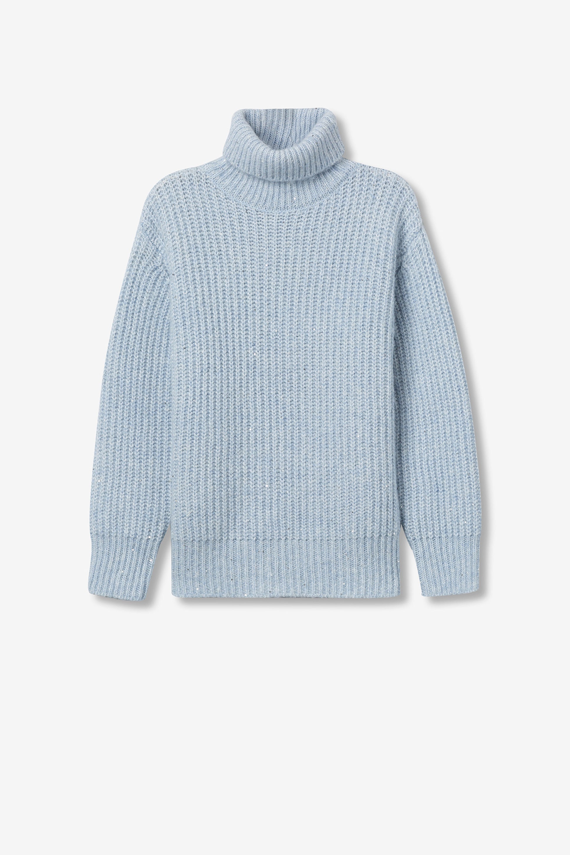 The roll neck visually lengthens the silhouette, the garter stitch makes it even more appealing, and the subtle touch of sparkle... is pure elegant flair.