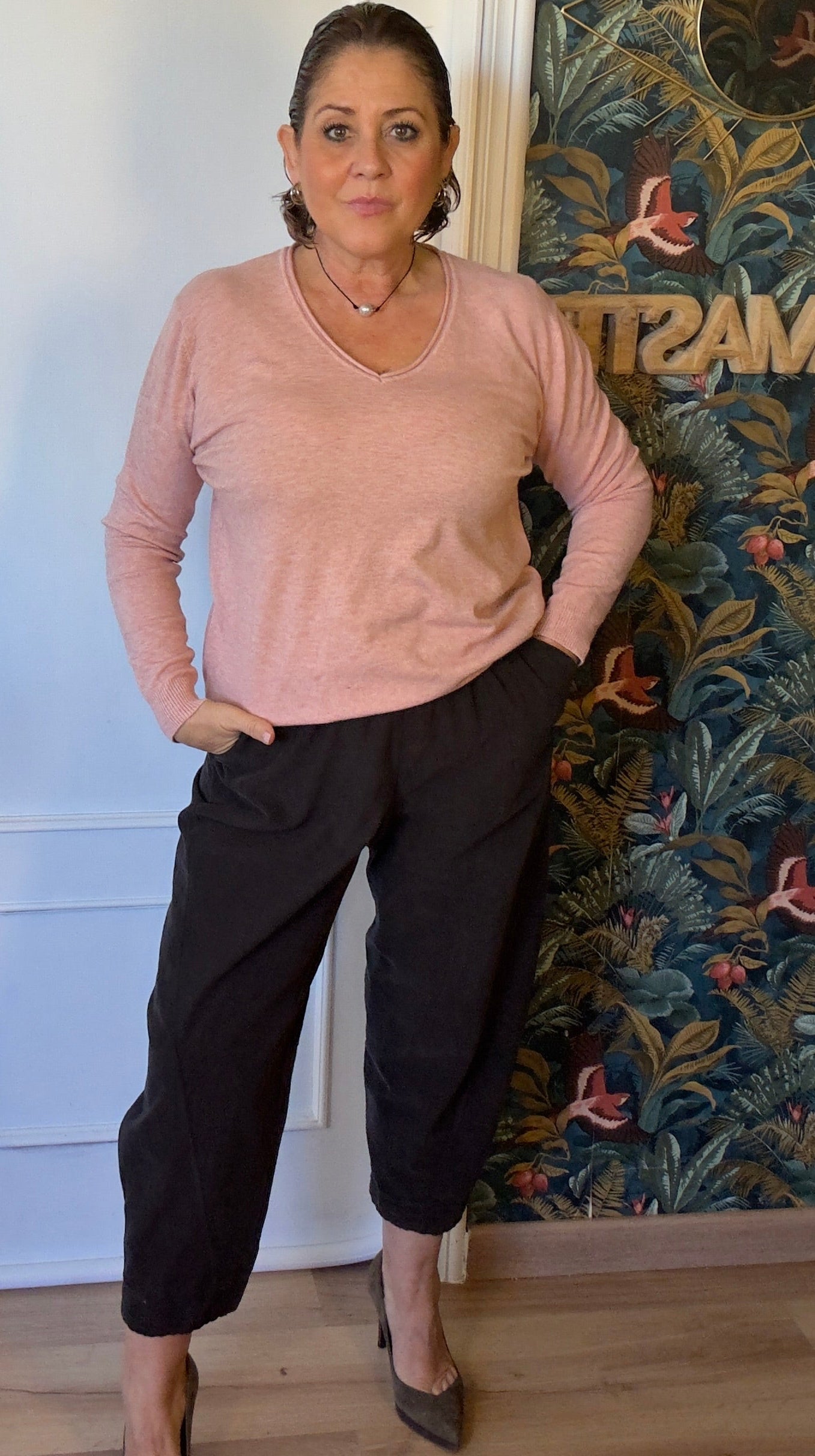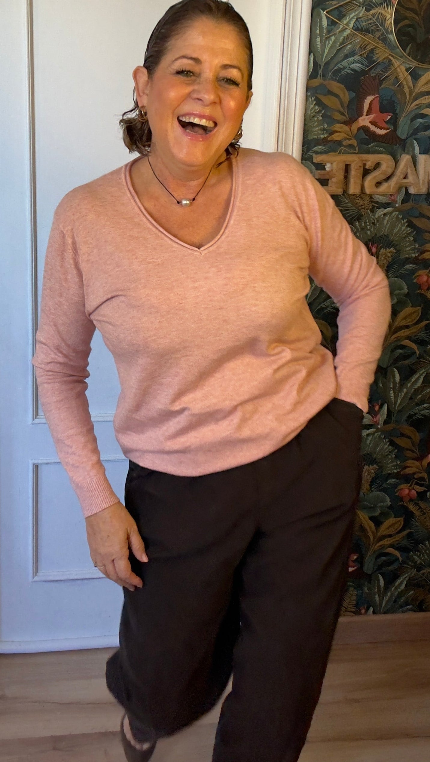 Suéter de punto de cuello pico suave en color rosa cálido.