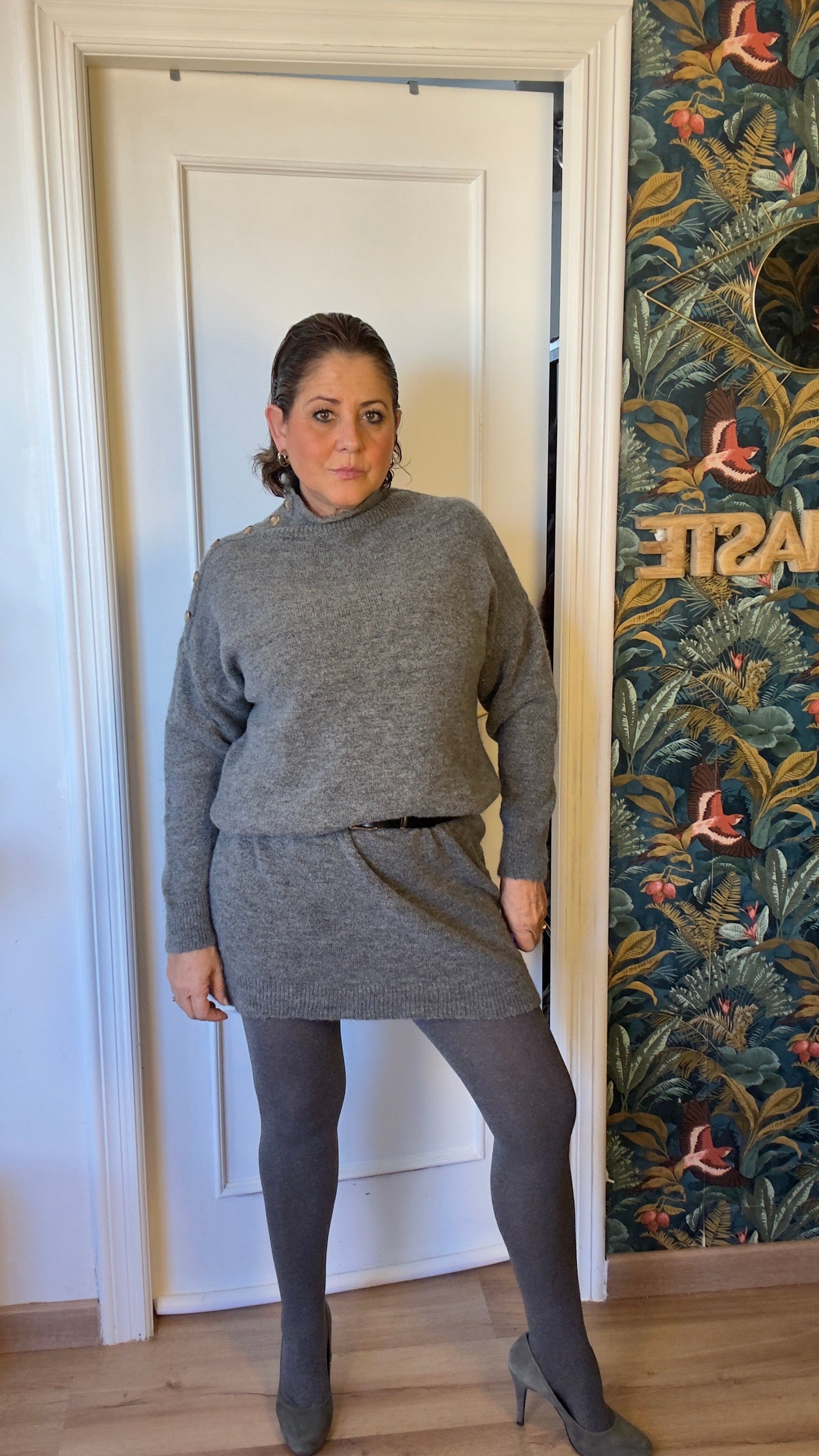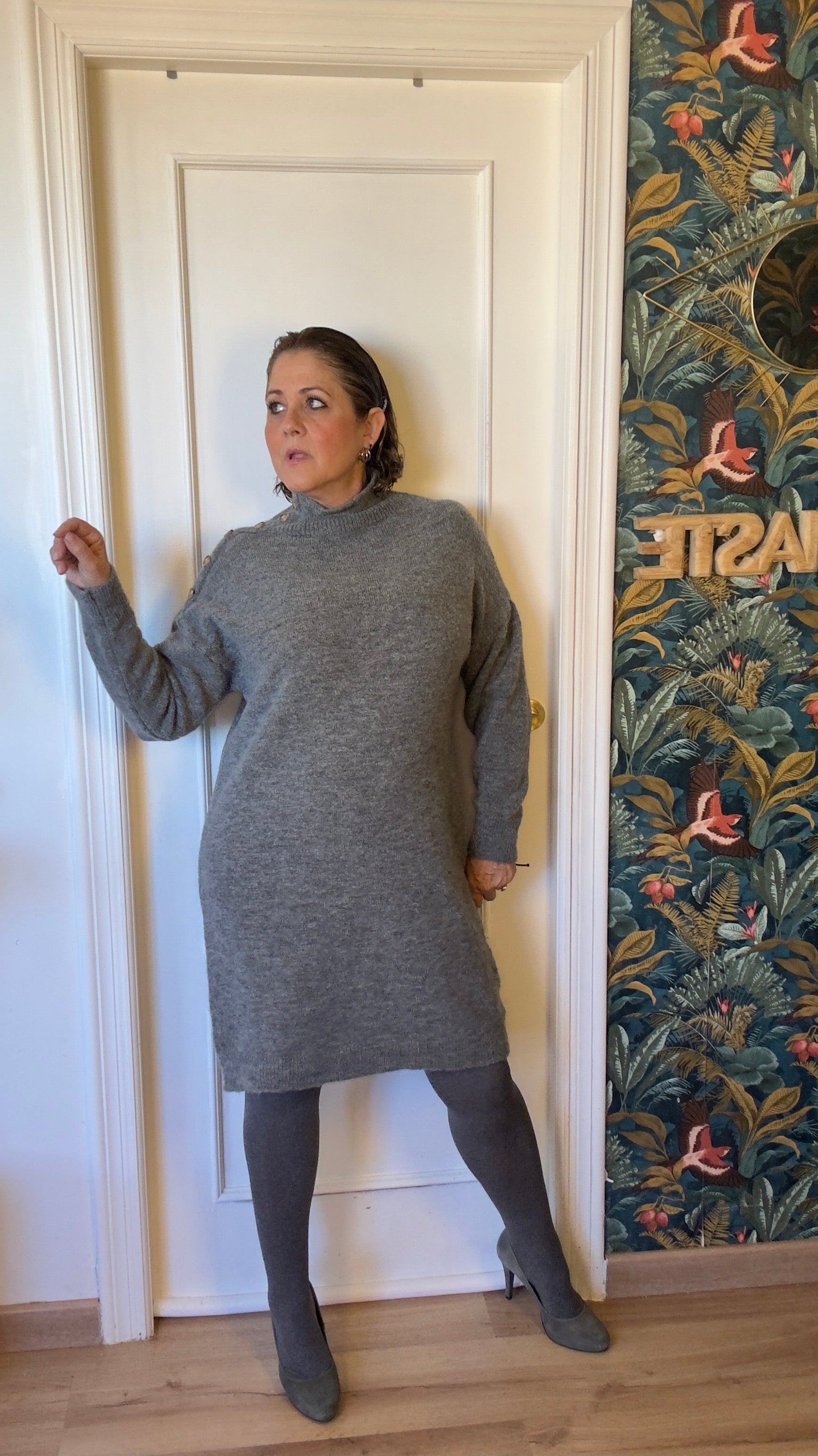 Vestido de punto gris , amplio y con botones en el lateral del hombro hasta el cuello, con cuello ligeramente subido tipo perkins