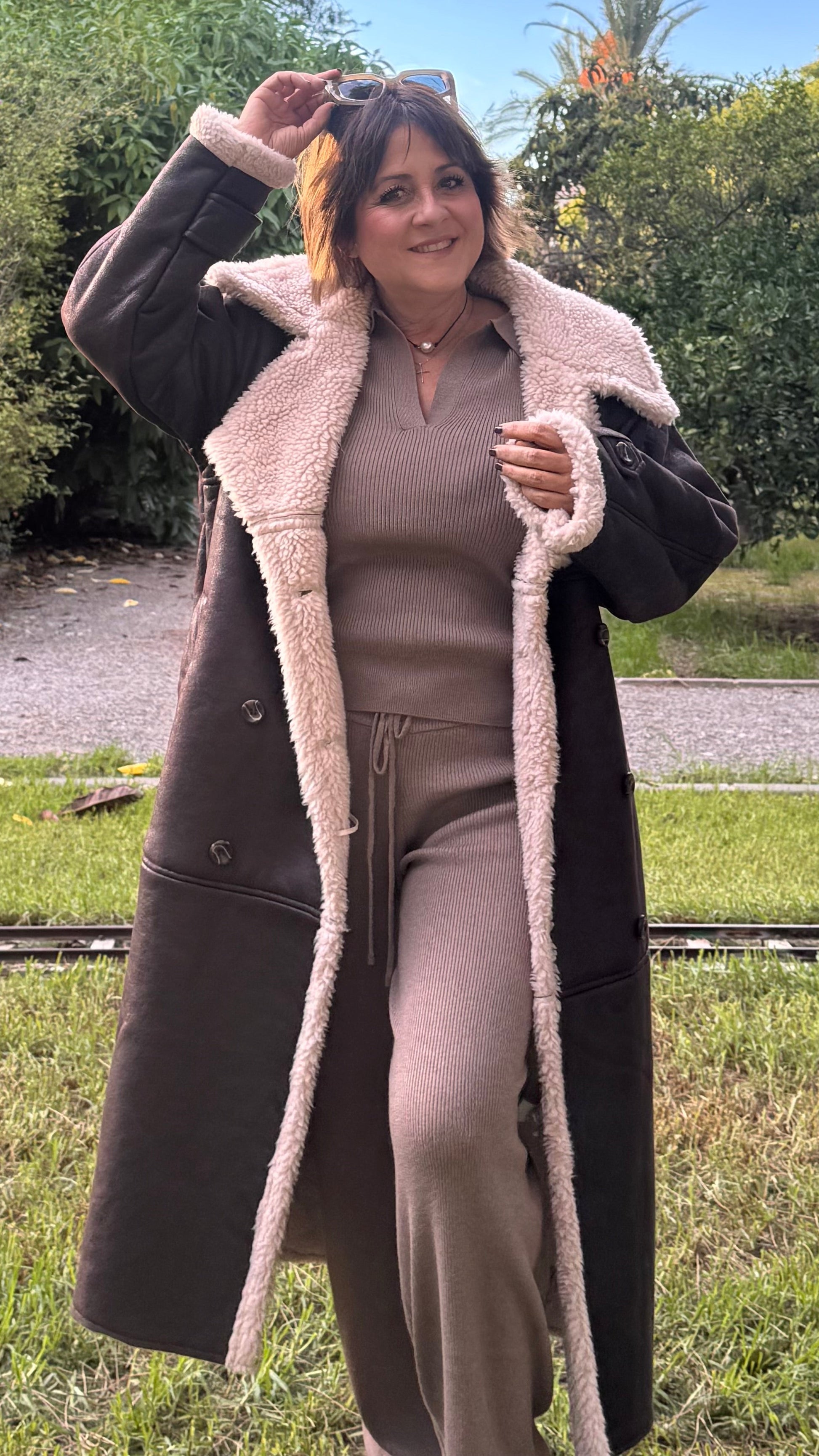 Abrigo de eco piel marrón chocolate y borreguito interior.