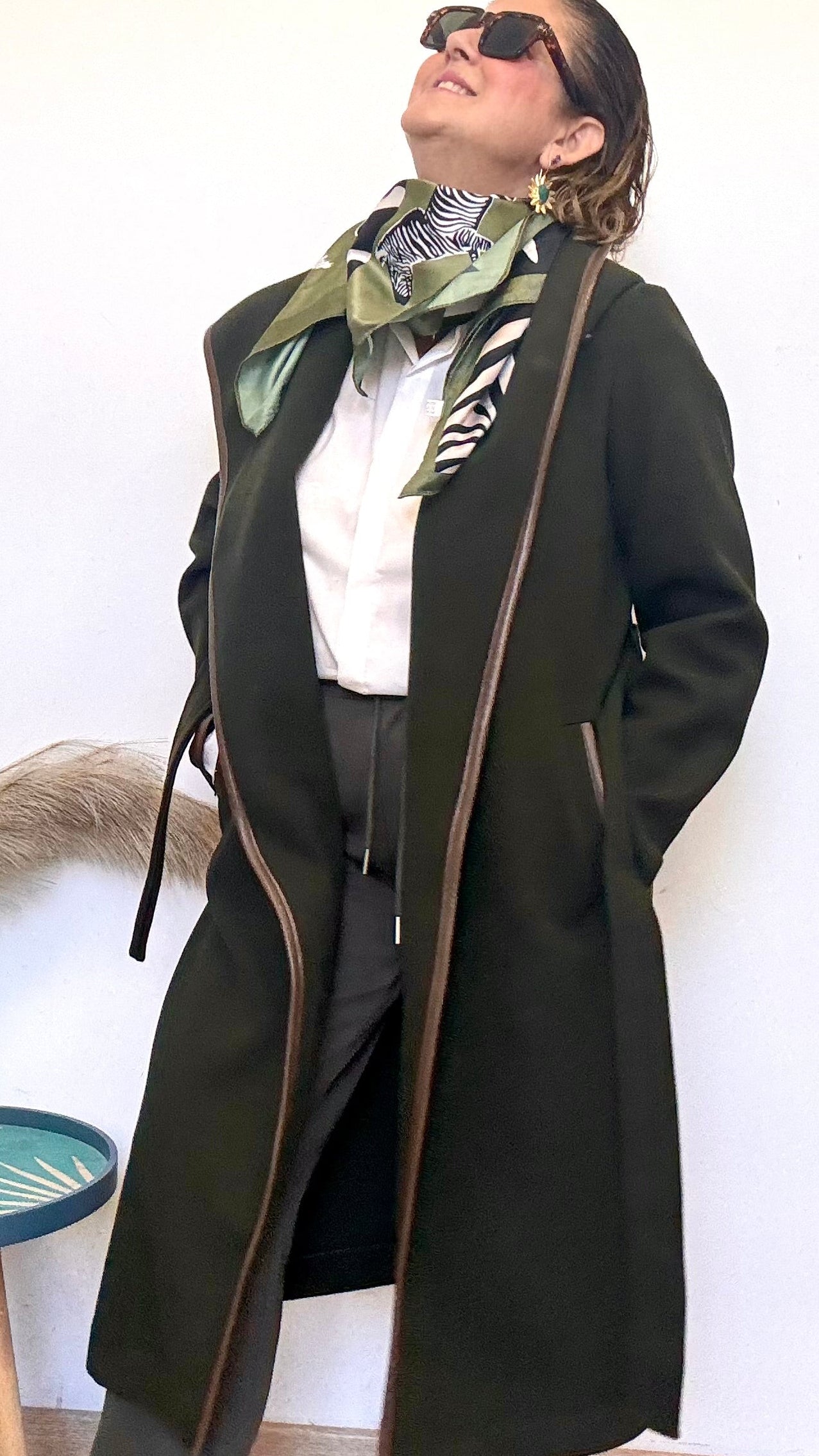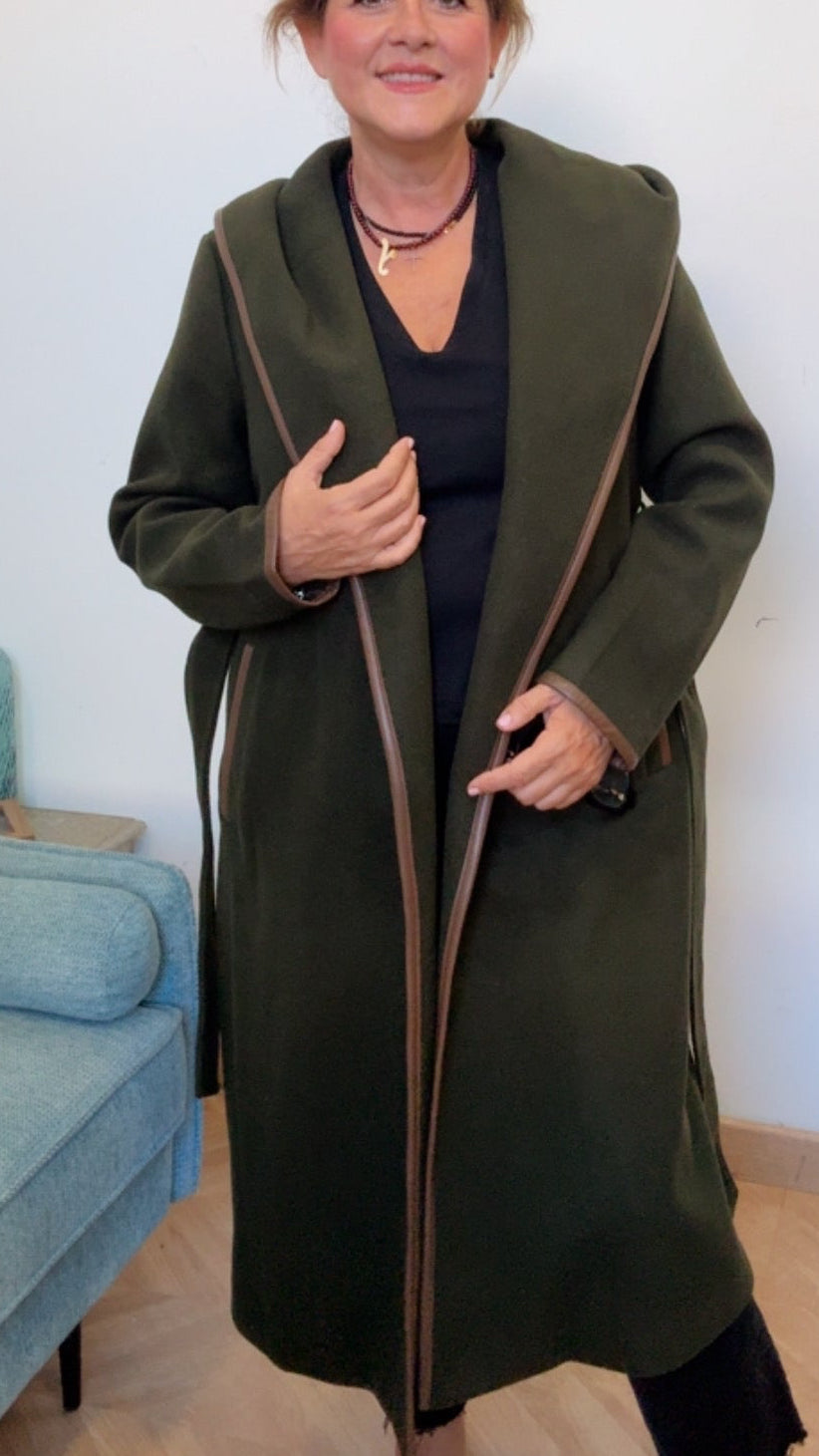 Ribete al filo de todo el abrigo en color chocolate en eco piel.