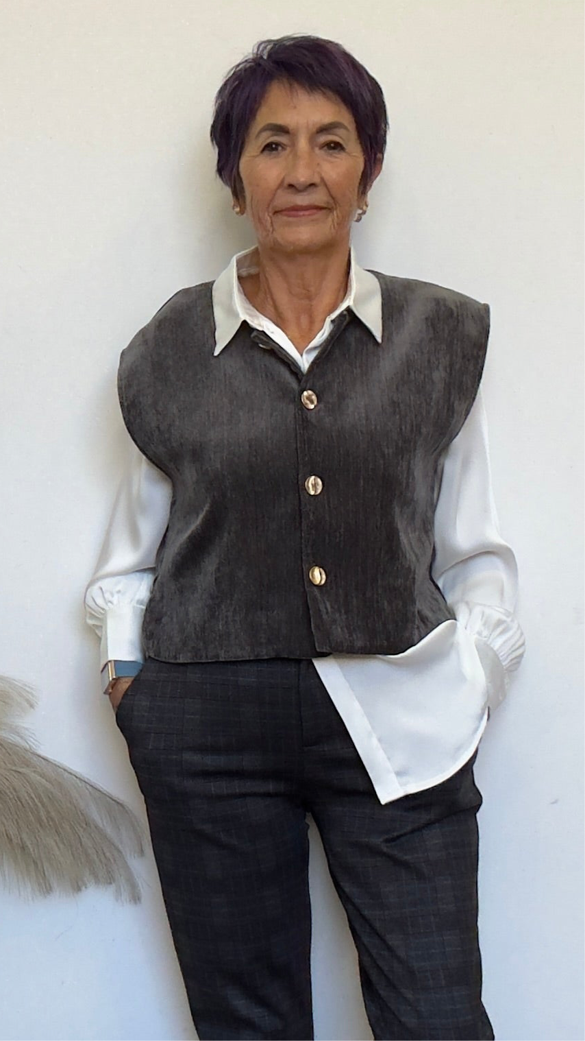 Chaleco de terciopelo talla única, con botones dorados en gris perla.