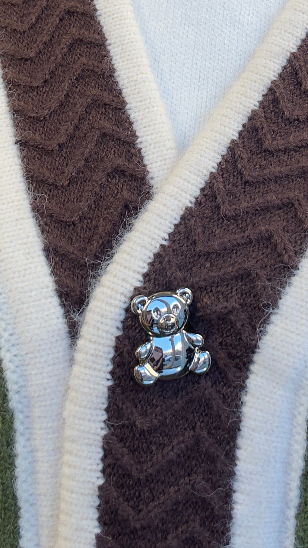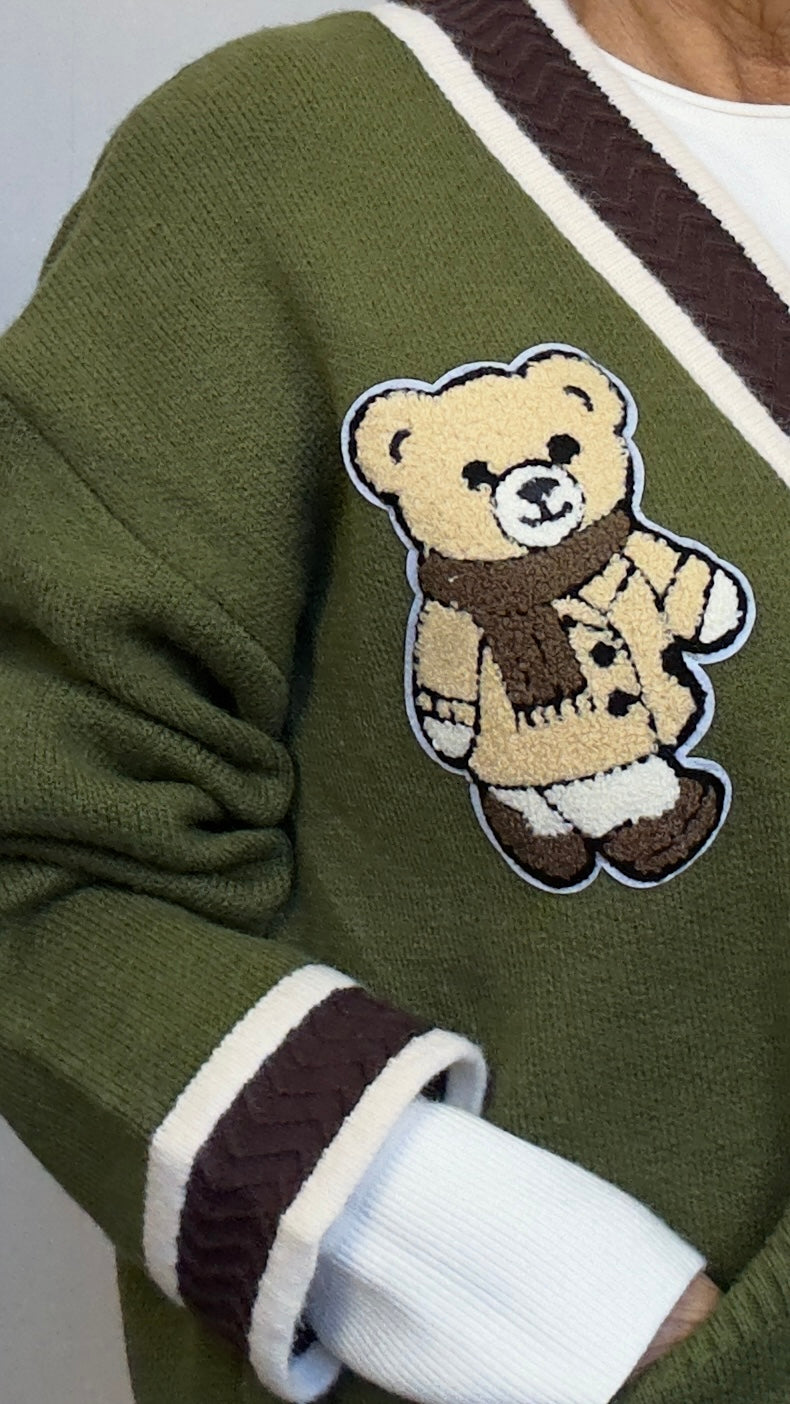 Chaqueta de punto gruesa con dibujo de Osito y botones de ositos plateados.