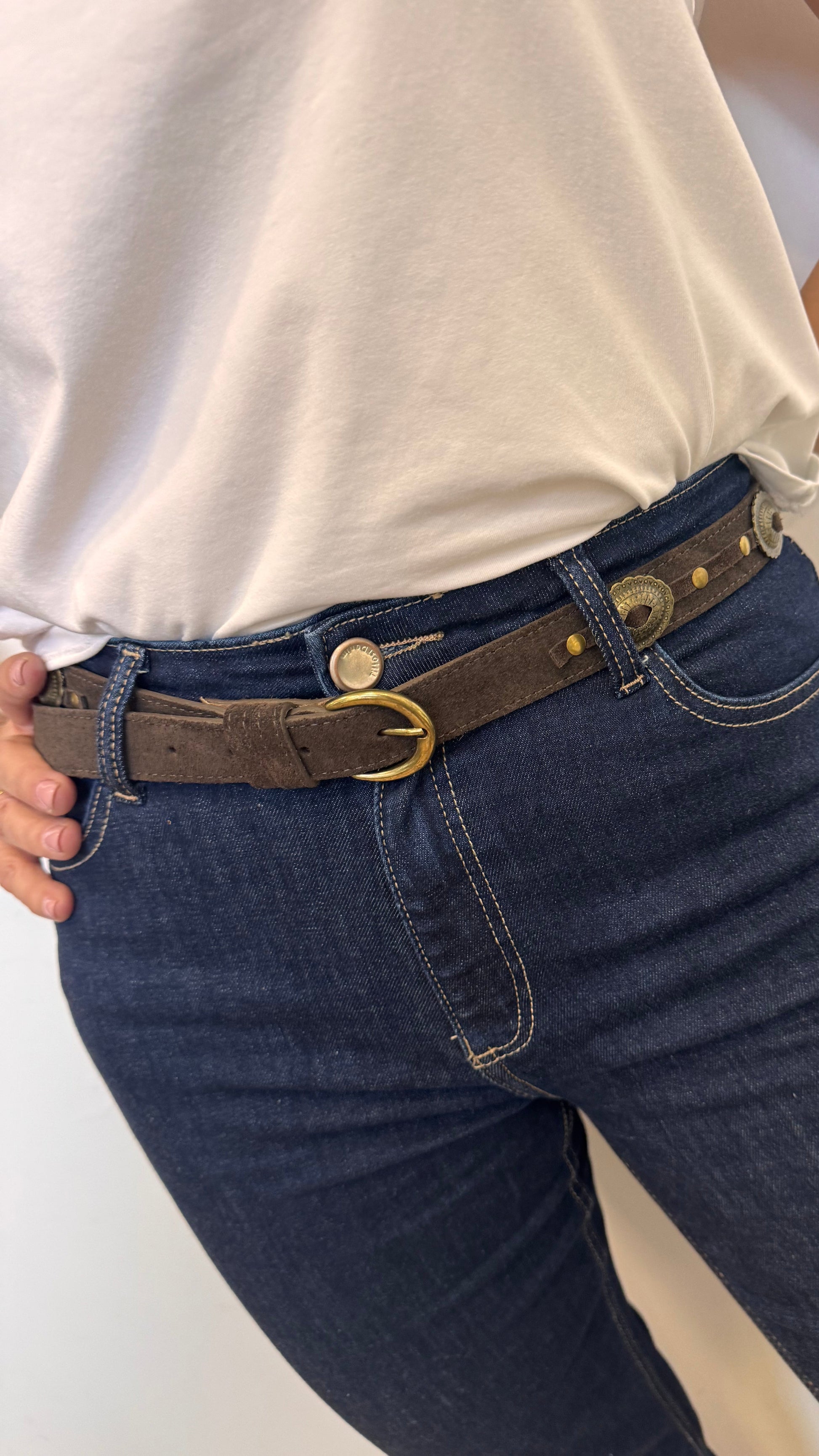 Cinturón con adornos por lo largo del cinturón, de ante.
