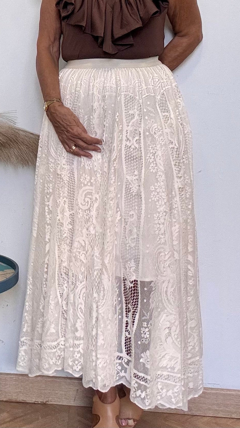 Falda de encaje preciosa de color crudo, con forro… y engomada en la cintura .