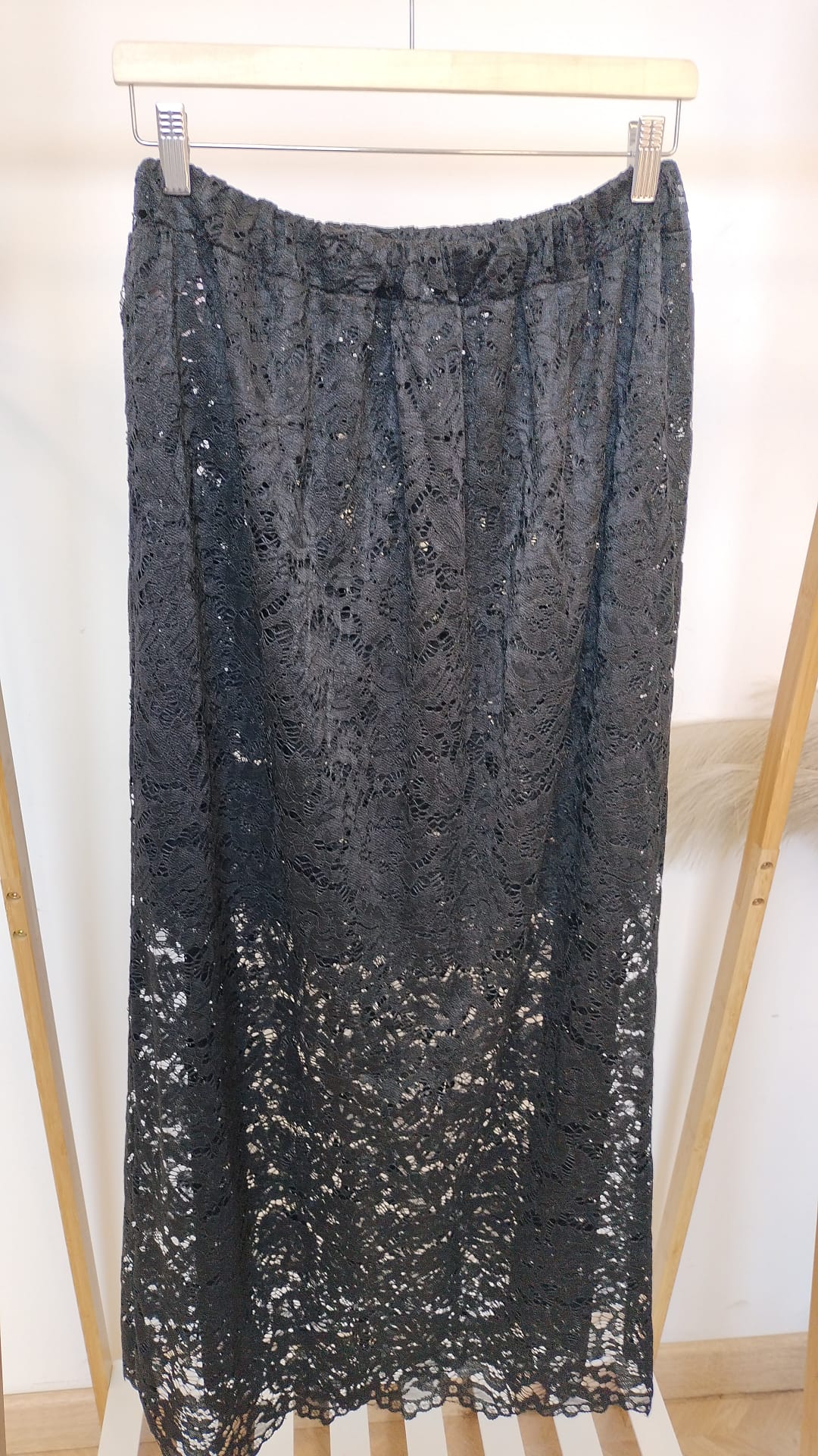 Falda de encaje negra de vuelo con mucho elastan, y recorte abajo. Engomada en la cintura .