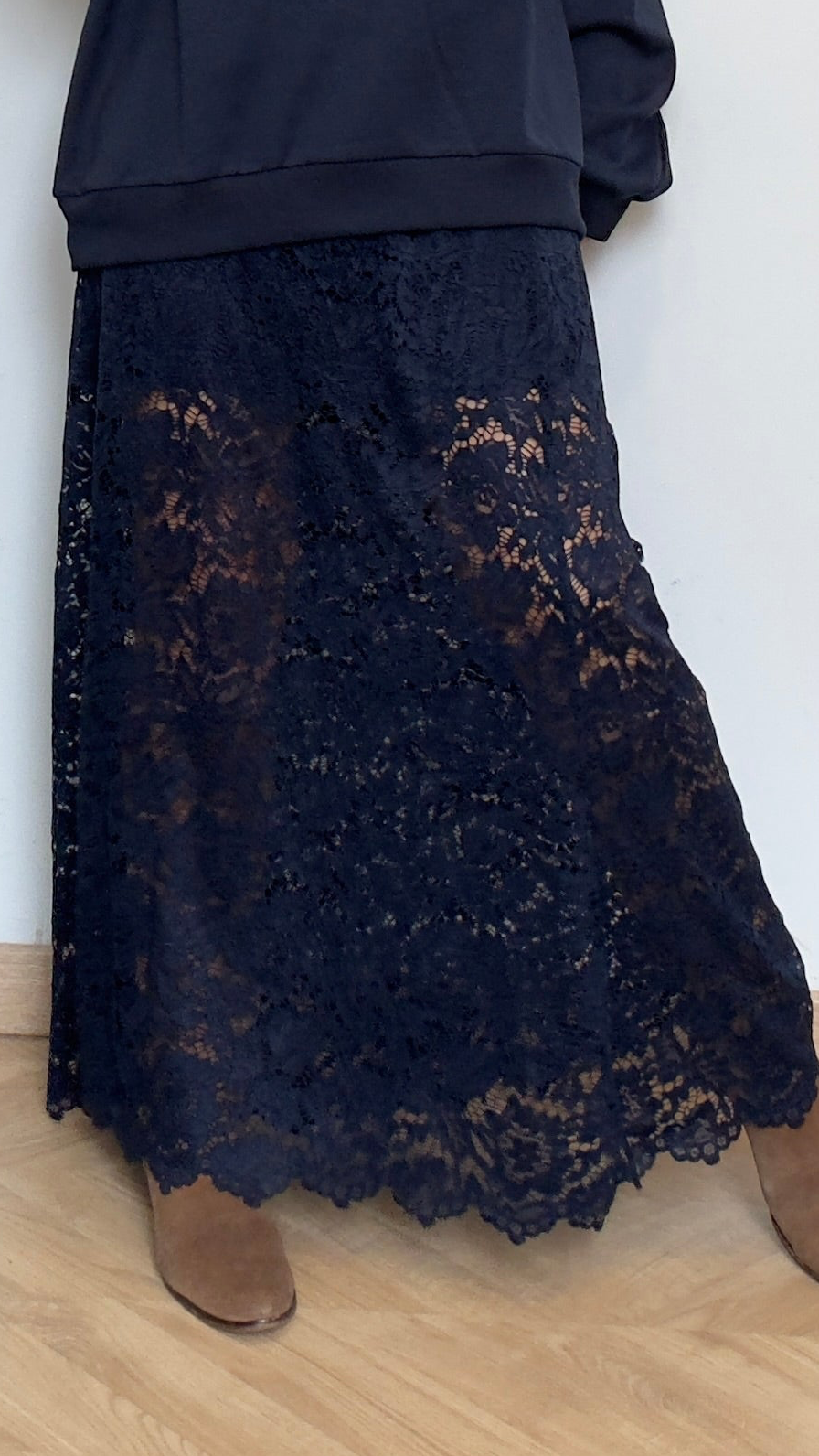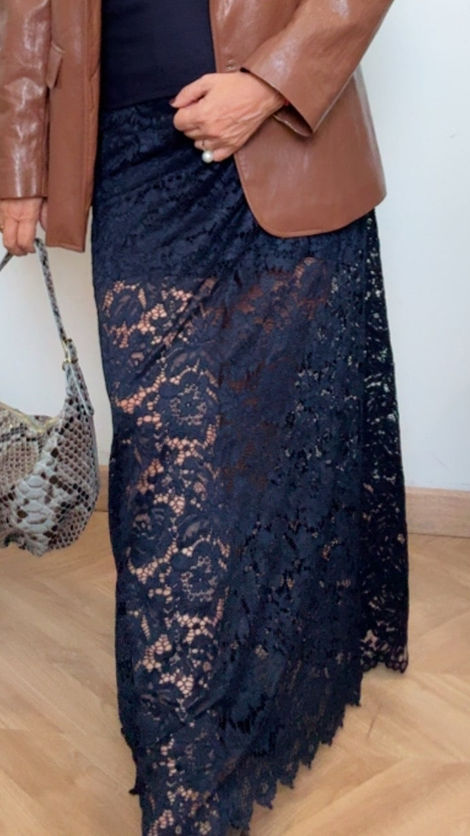 Falda de encaje azul larga ., con ondas abajo y forro .