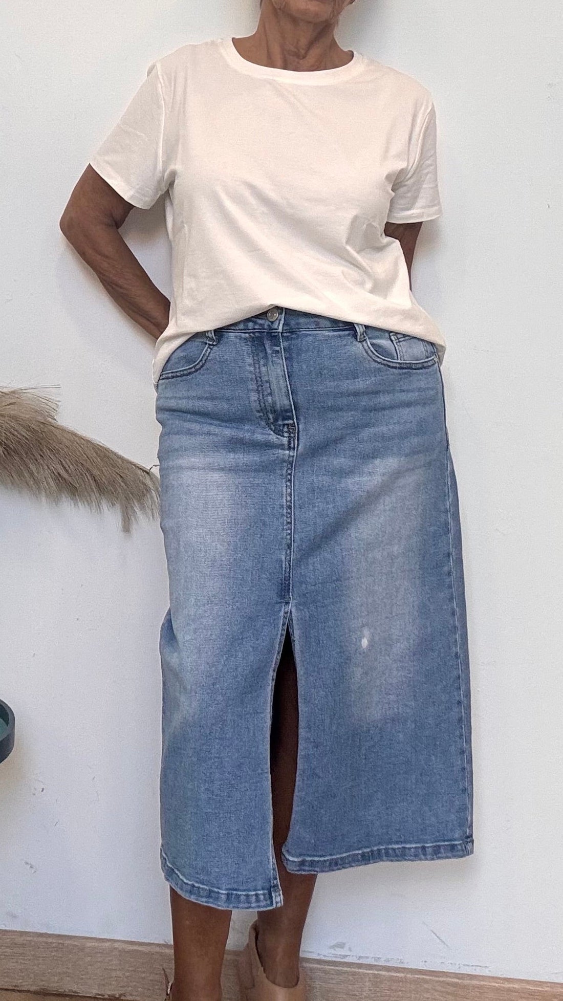 Falda vaquera de corte midi con apertura delantera.