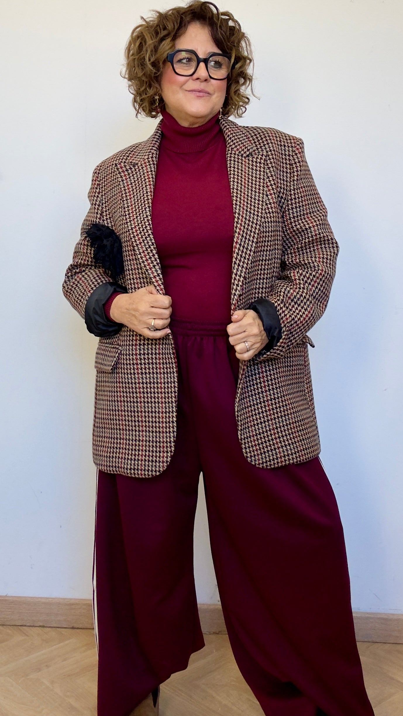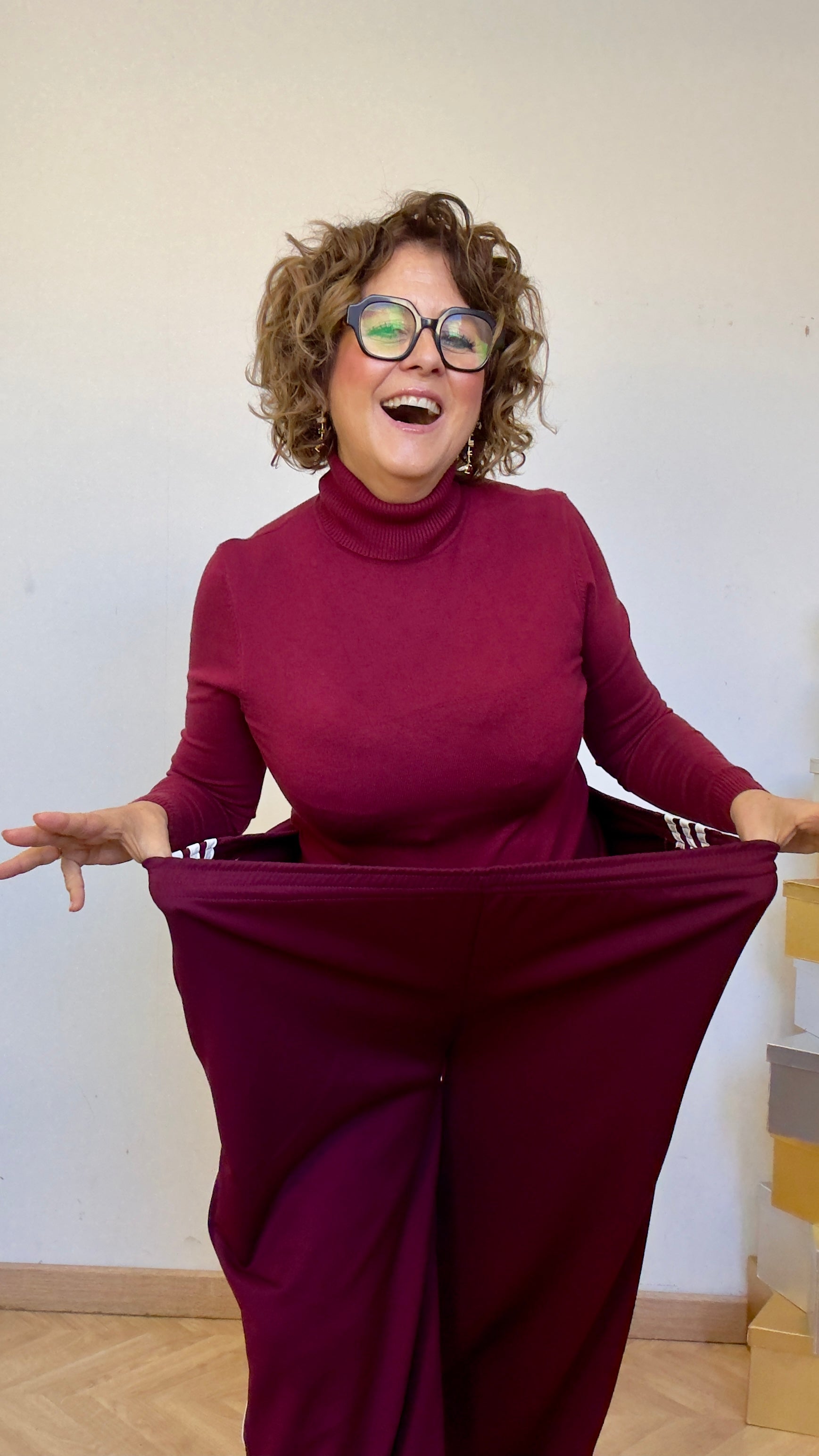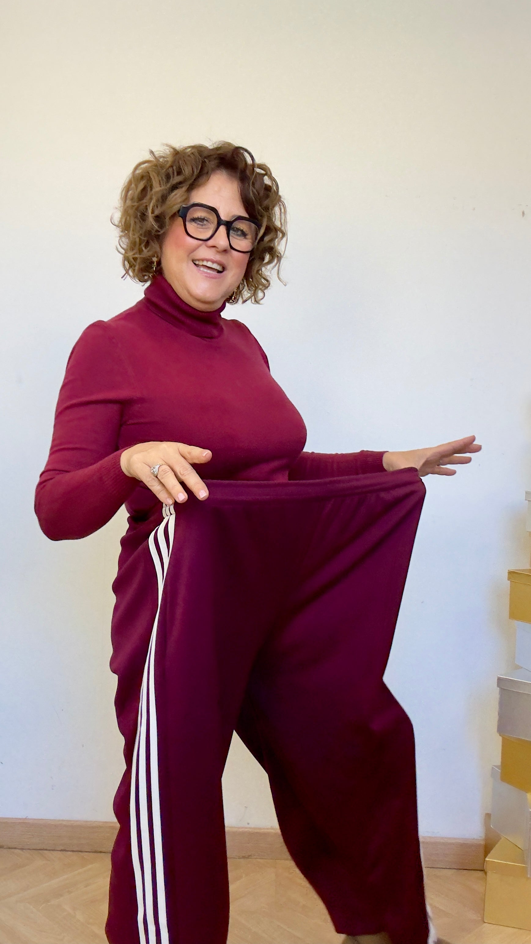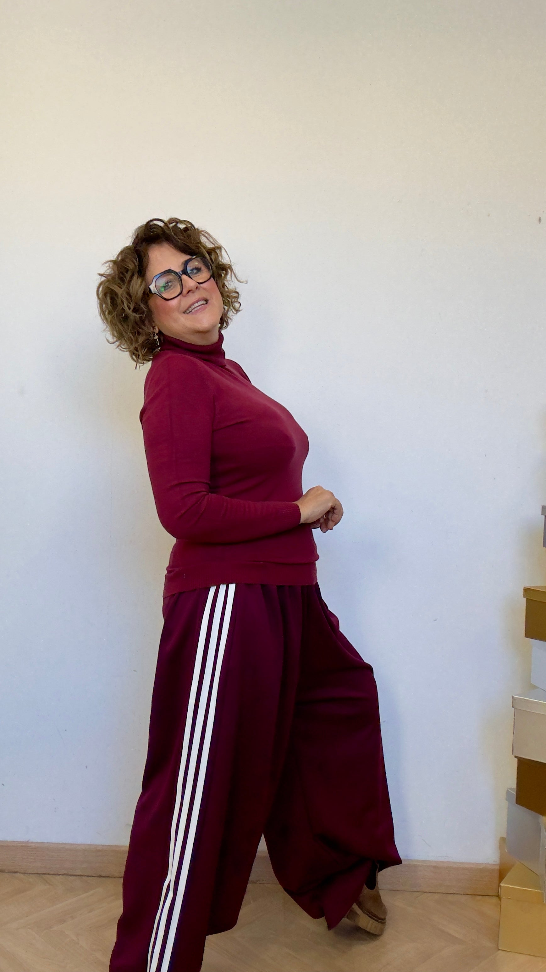 Pantalón súper over size , amplio y con mucho rollo, en burdeos con blanco.