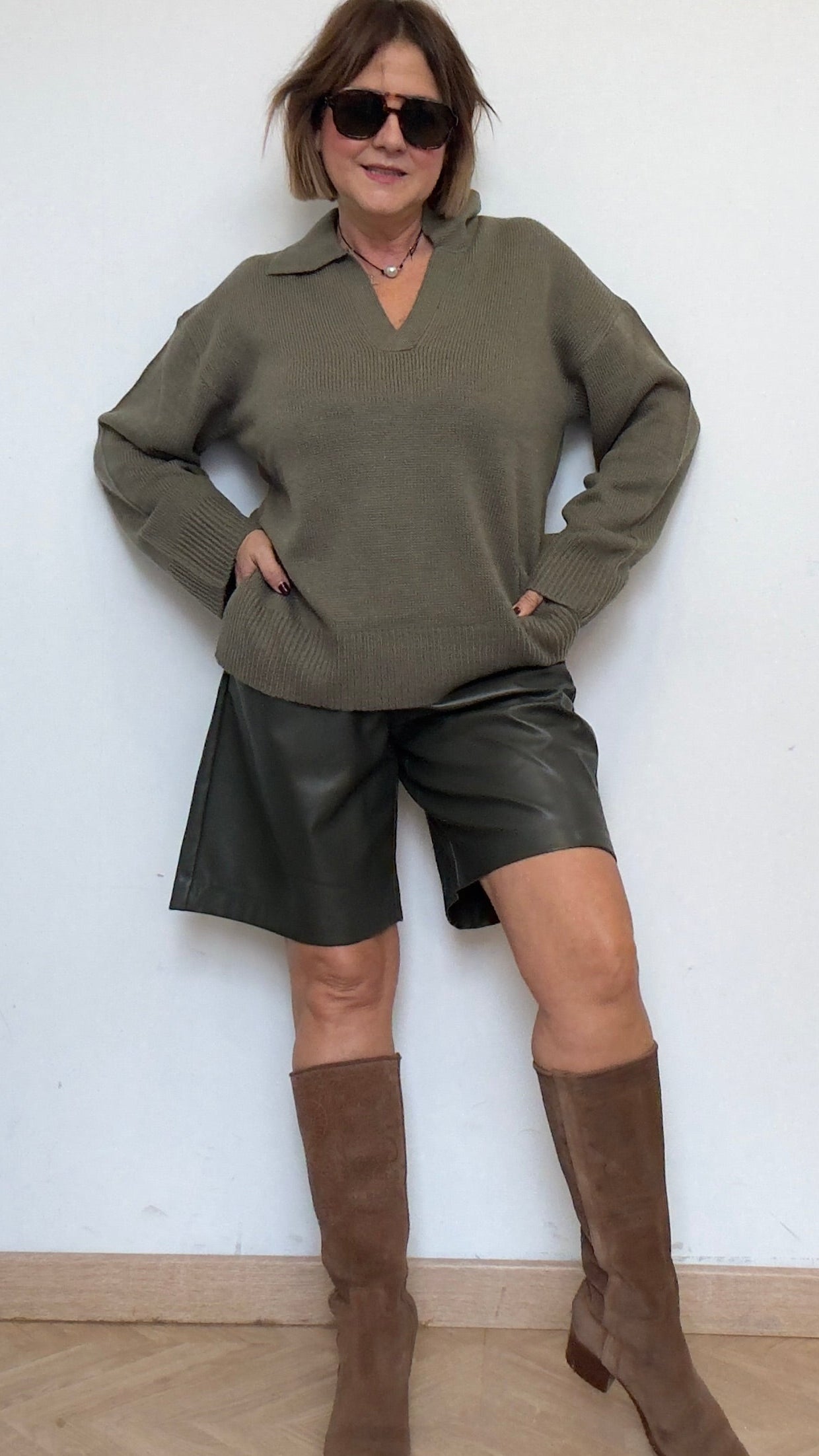 Pantalón corto de eco piel,con pinzas y bolsillos laterales en color verde.