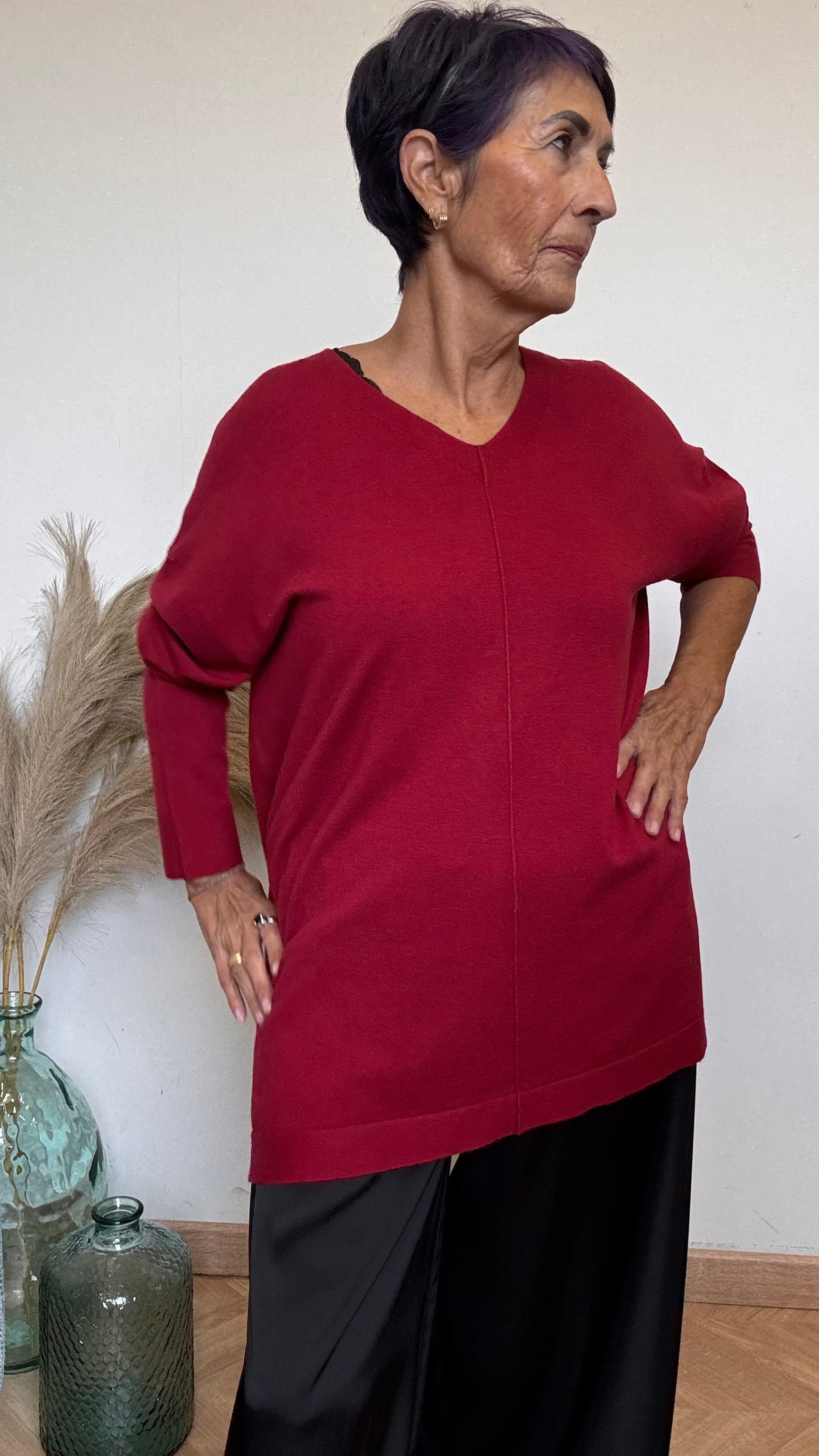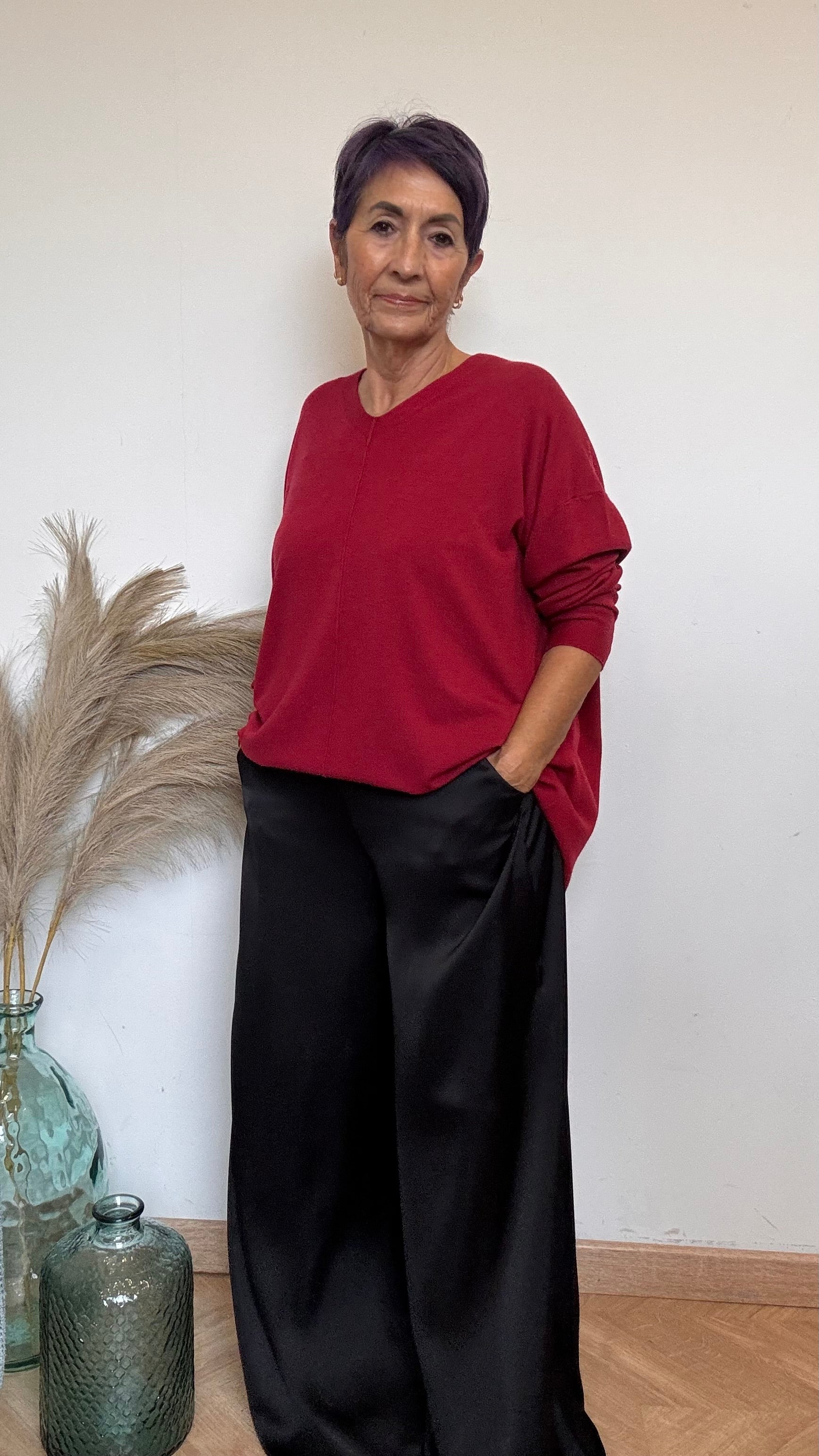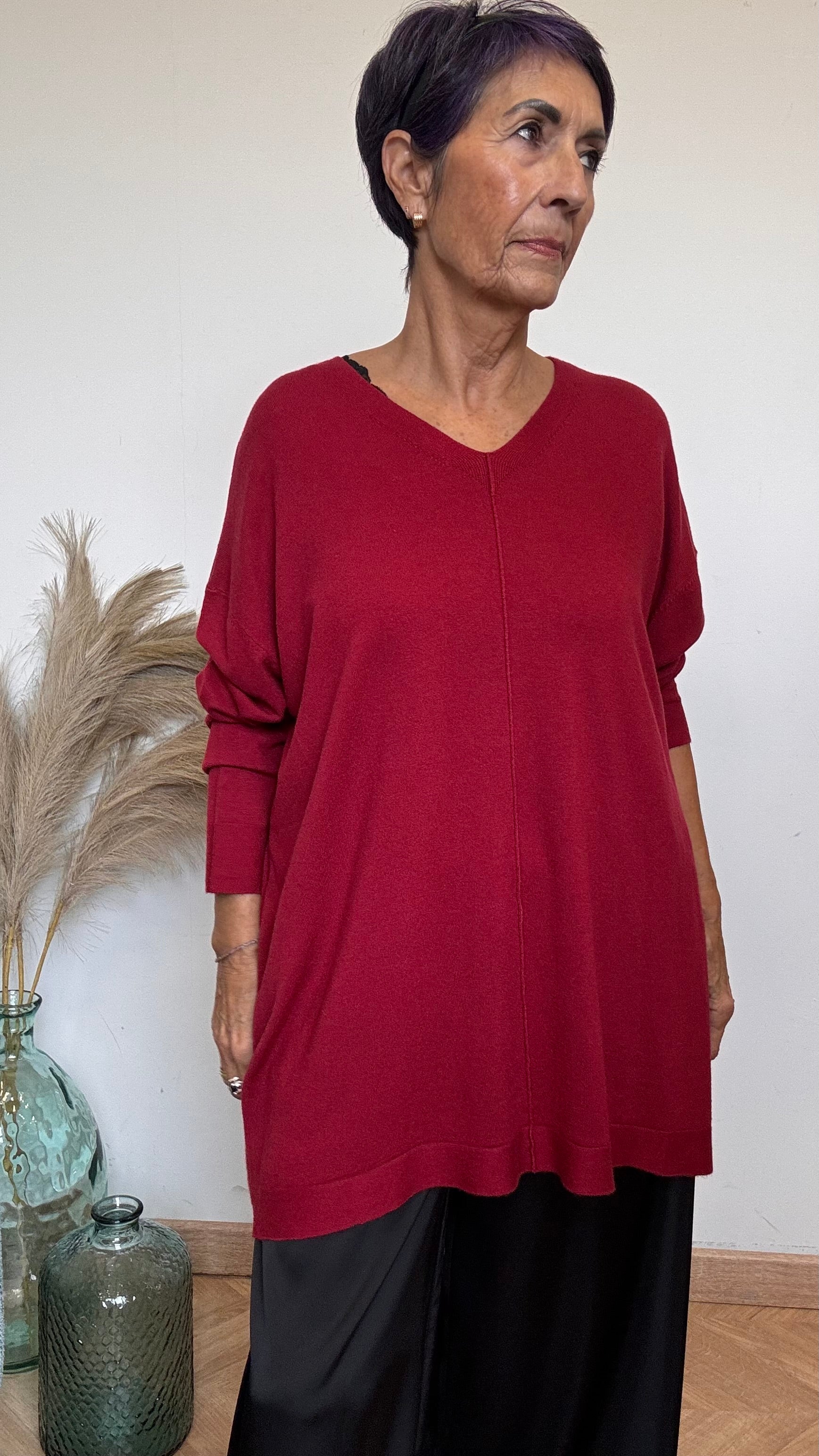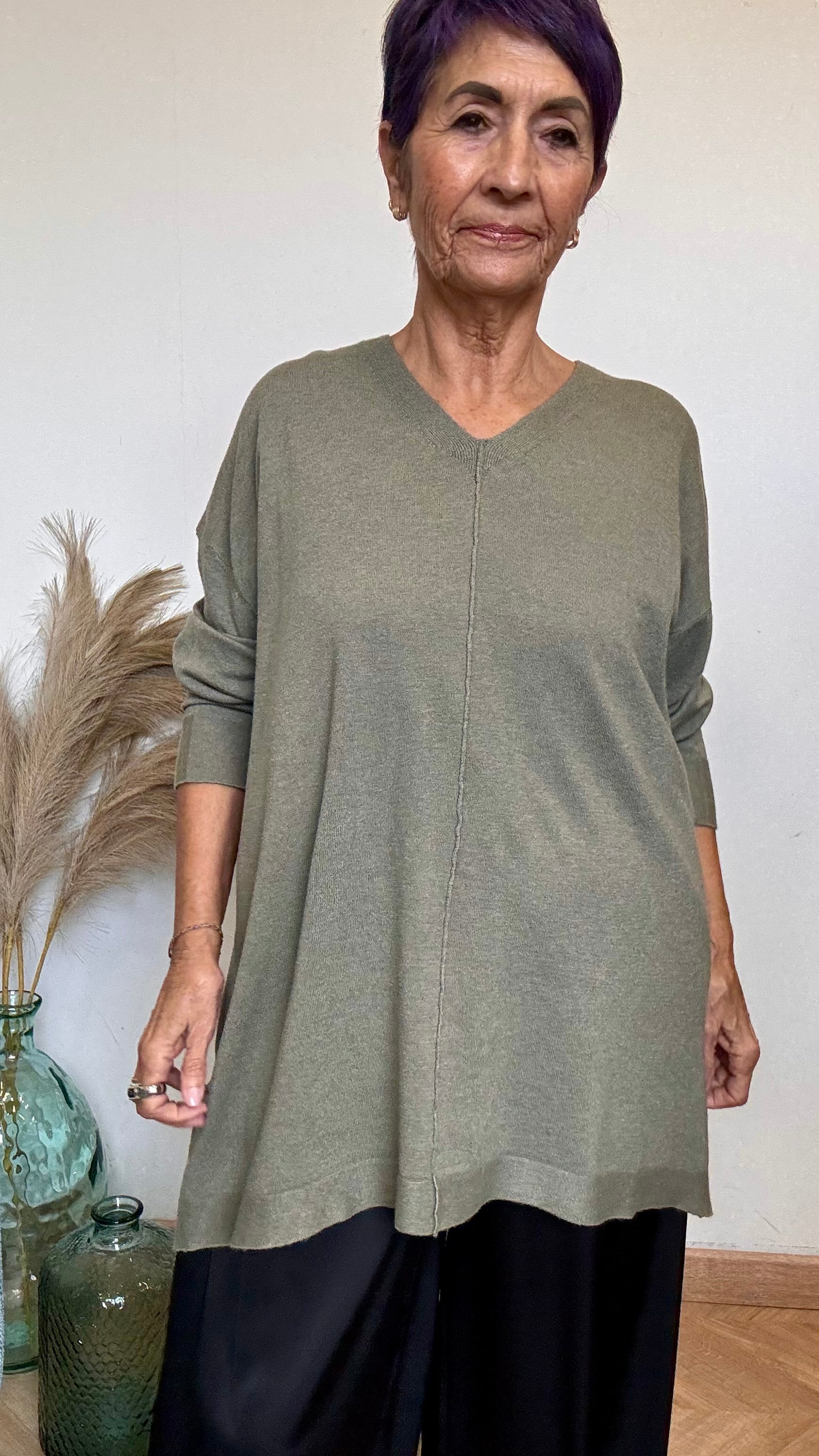 Variedad de colores disponibles en el suéter Florencia de punto, largo y amplio con escote en pico .