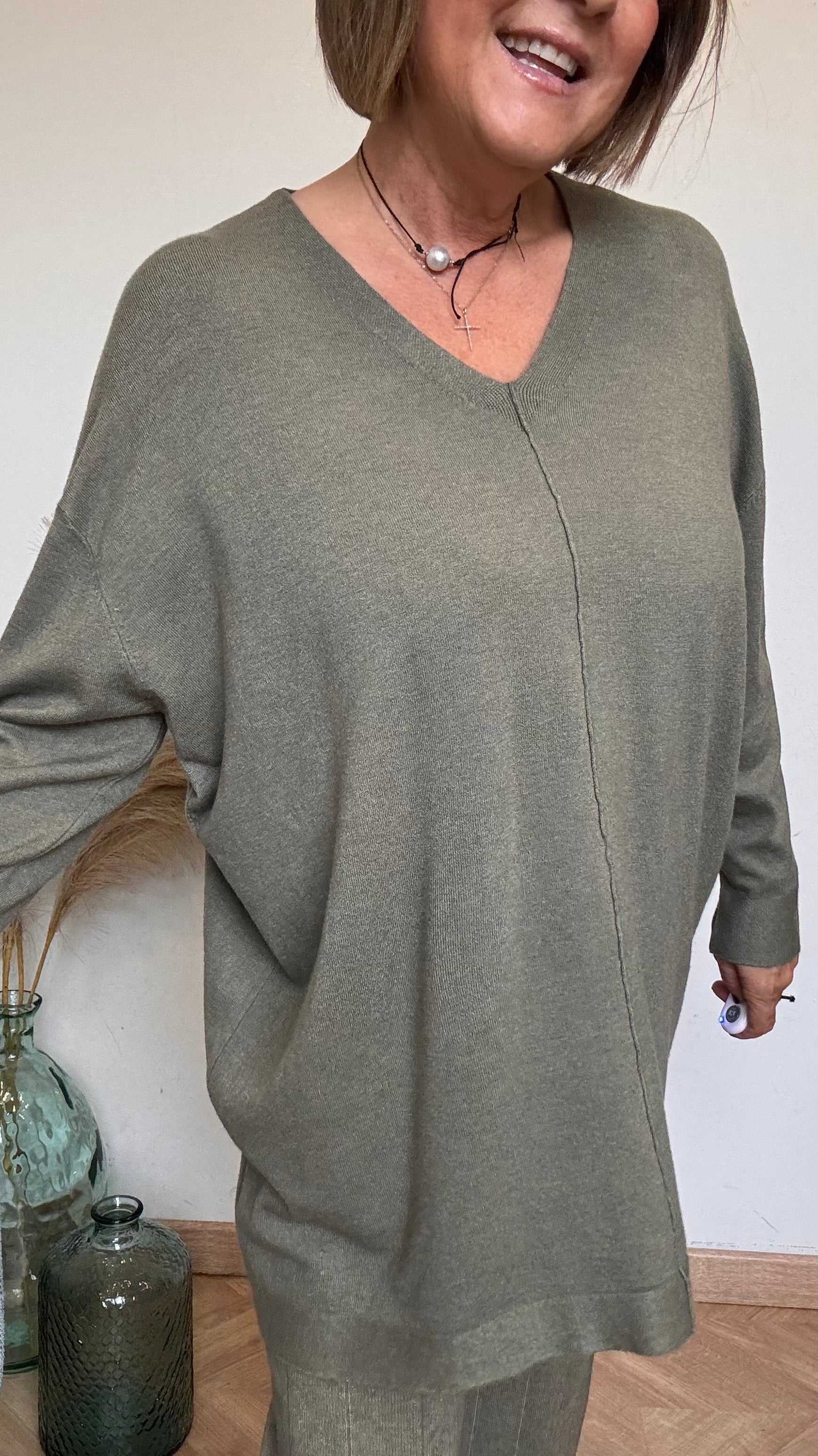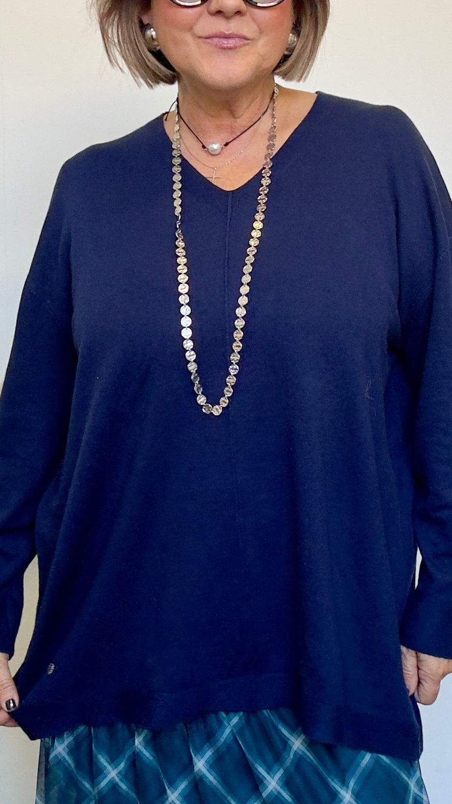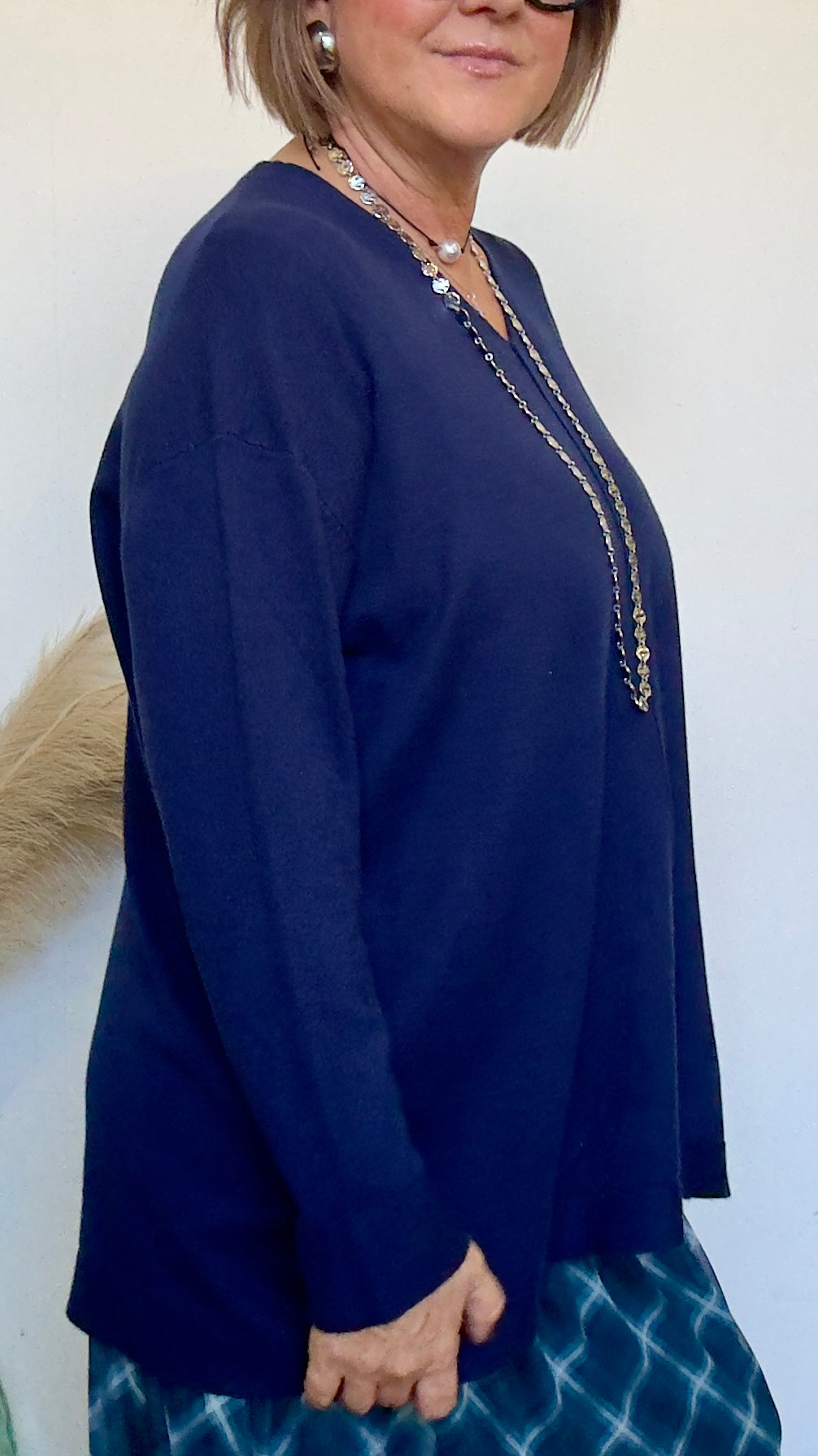 Variedad de colores disponibles en el suéter Florencia de punto, largo y amplio con escote en pico .