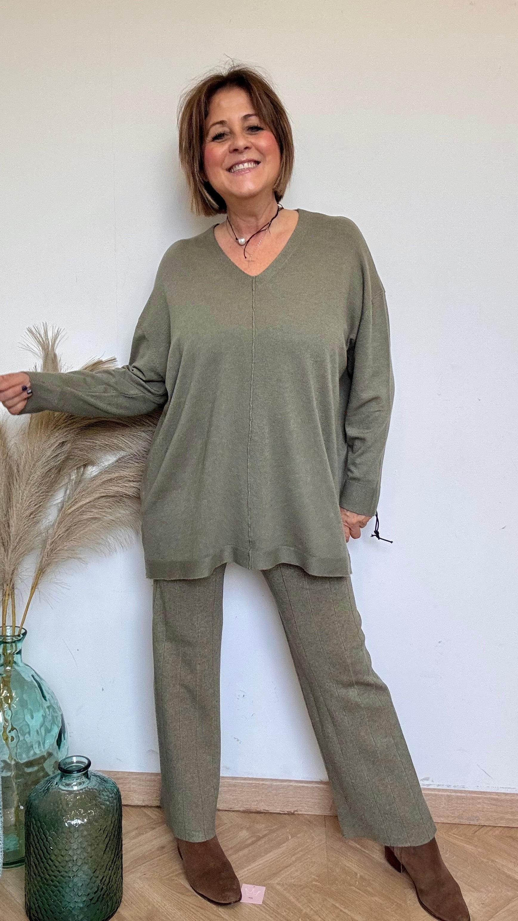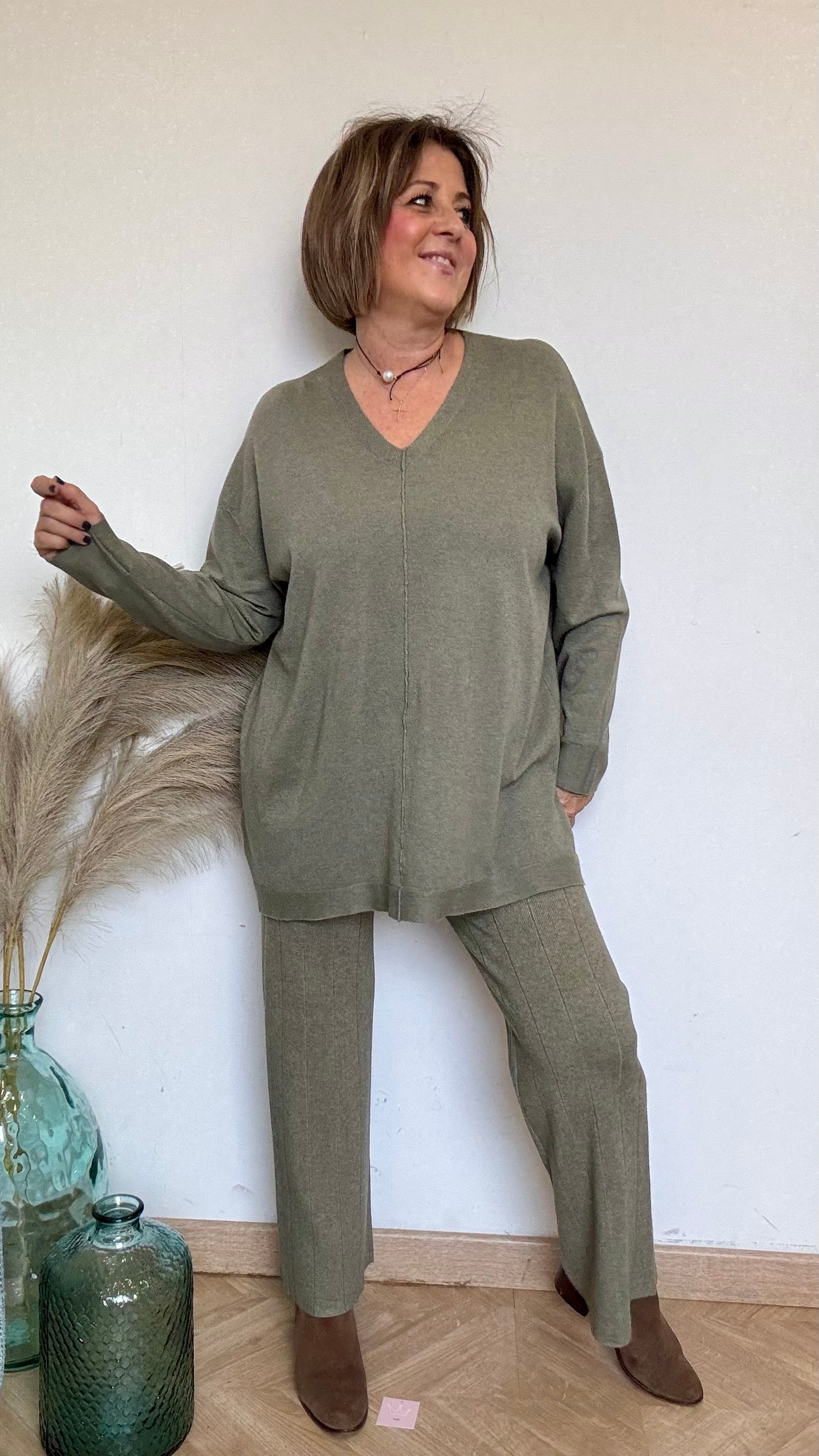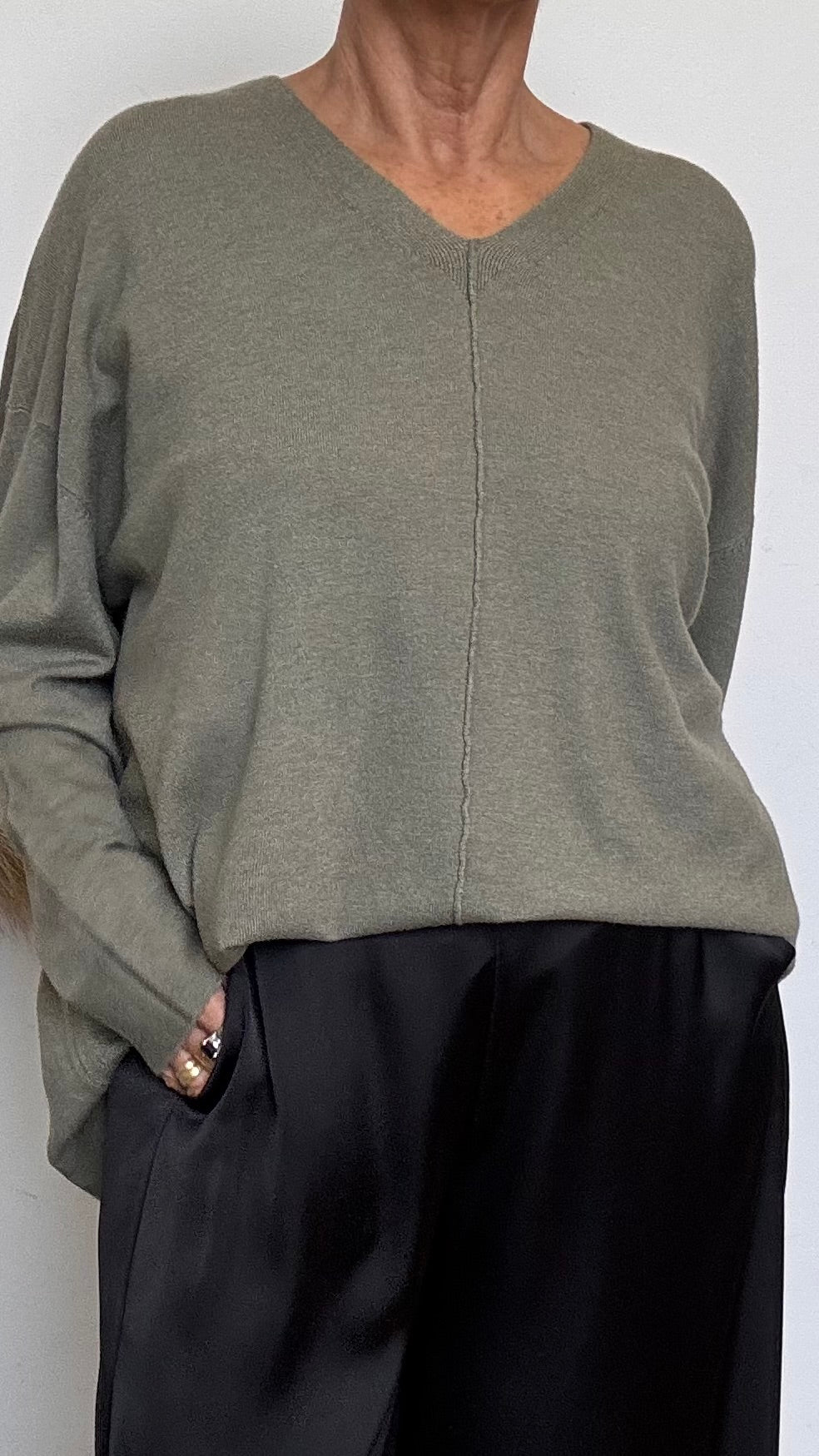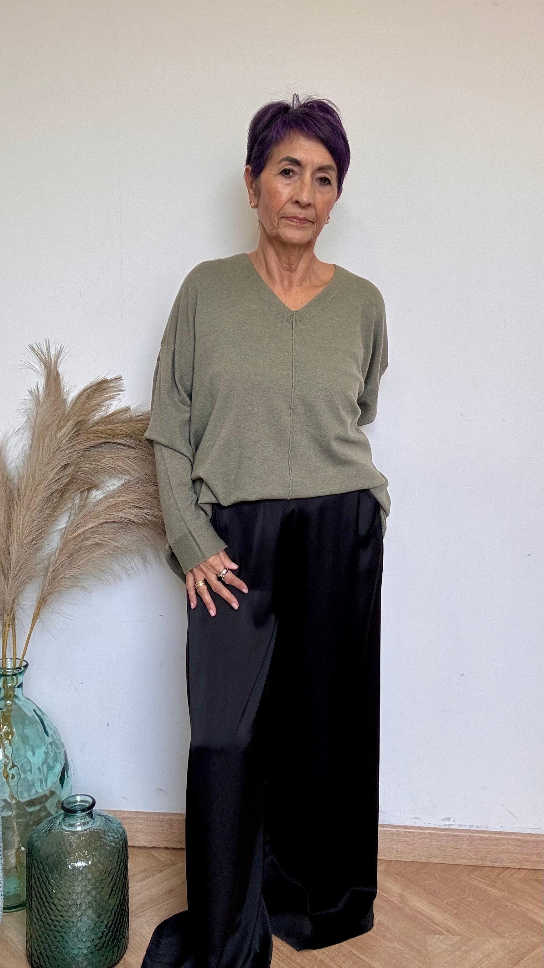 Variedad de colores disponibles en el suéter Florencia de punto, largo y amplio con escote en pico .