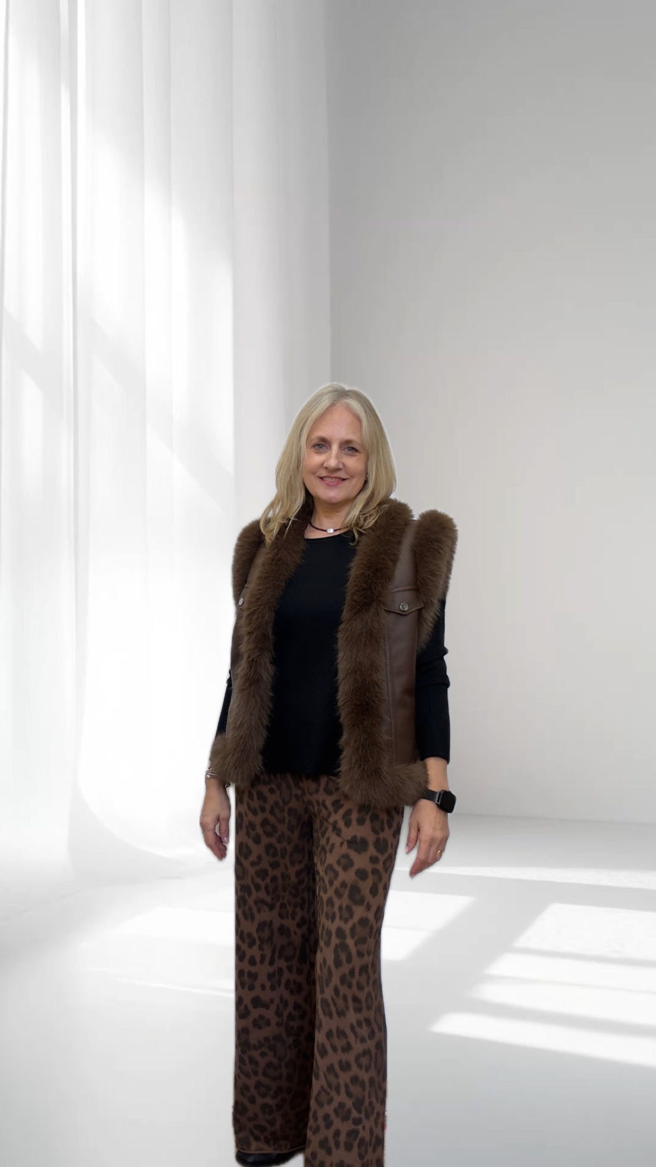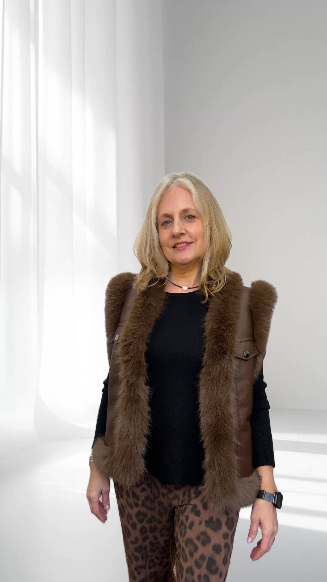 Chaleco de eco piel con bolsillos laterales que combina estilo y confort. Su interior de pelo sintético suave te envuelve en calidez, mientras que su diseño versátil te permite crear múltiples looks.