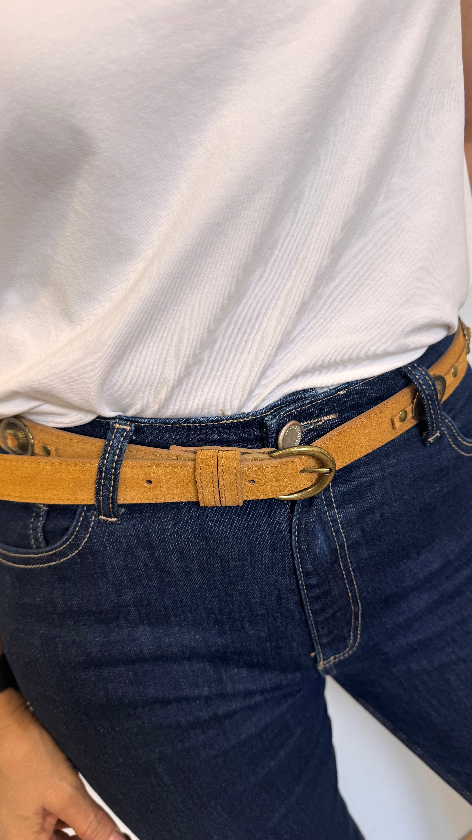 Cinturón de color camel en ante, con adornos a lo largo del cinturón