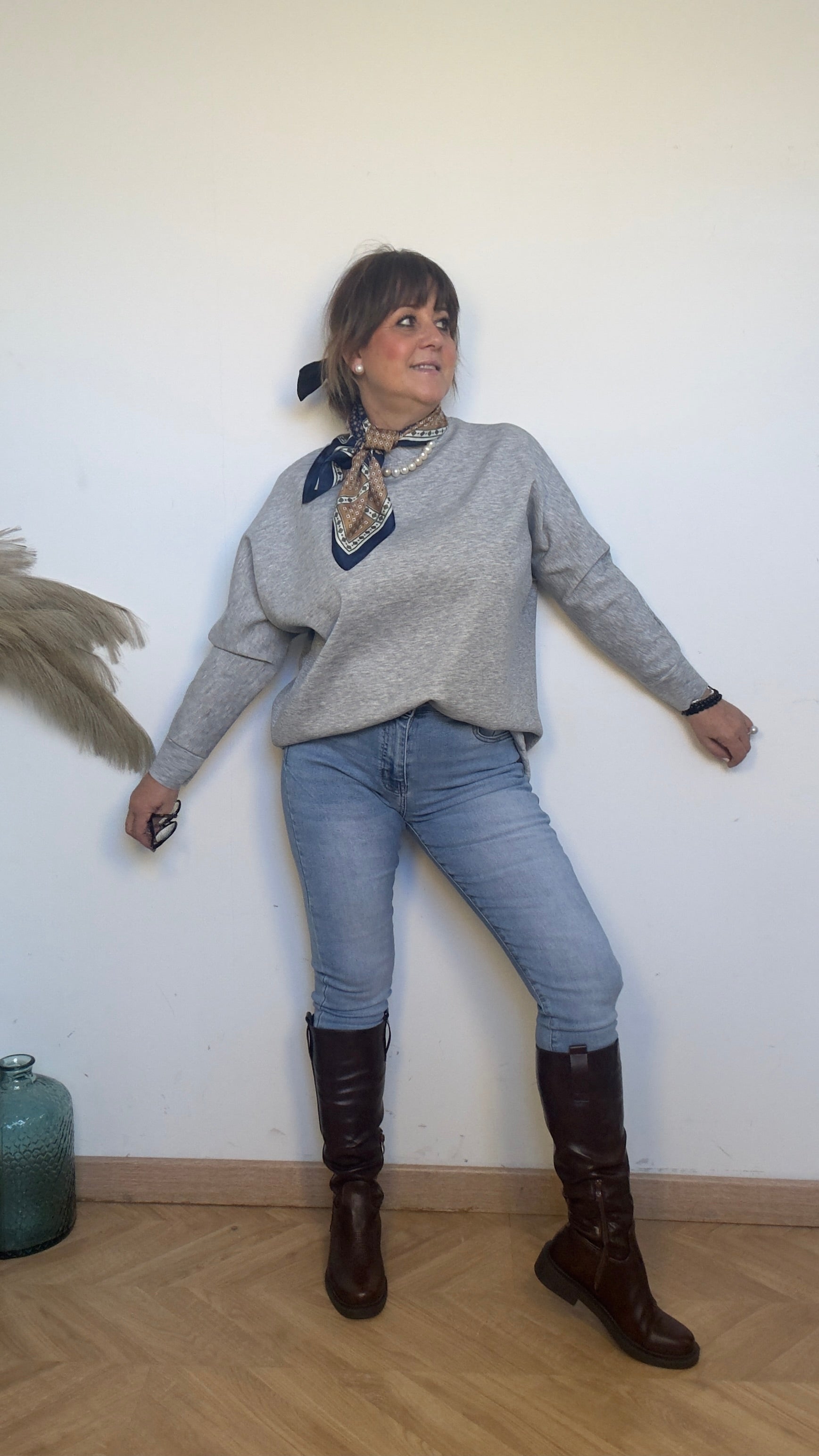 Sudadera over size de color gris con cuello redondo y mangas ranglan.