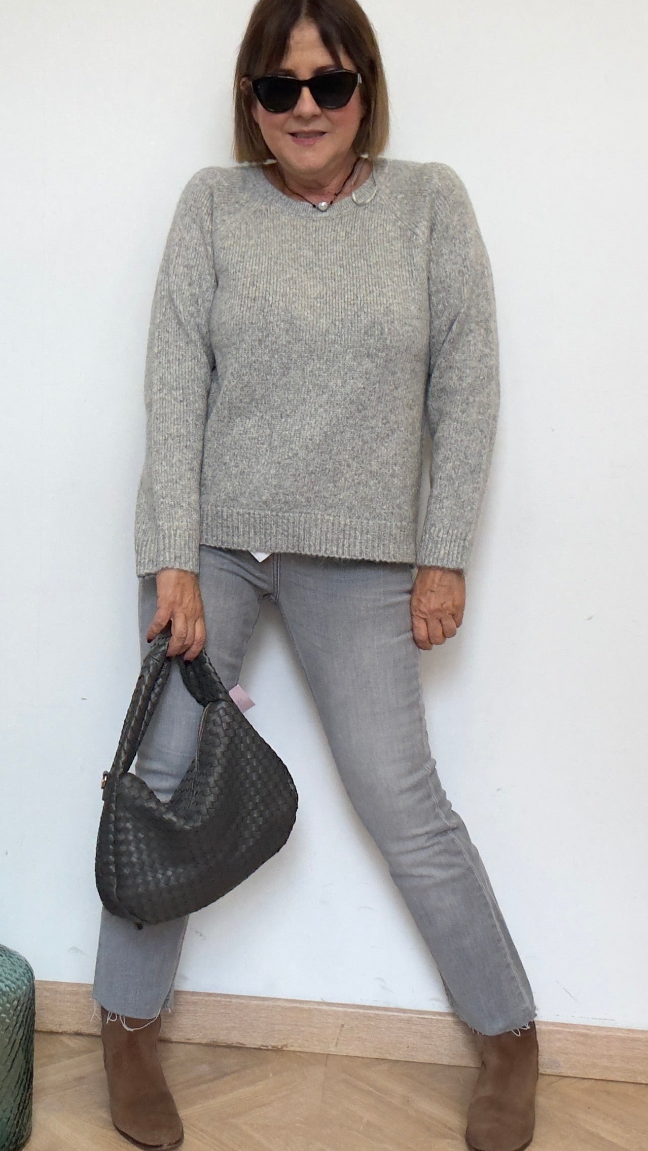 Suéter de punto gris… con cuello redondo y tacto