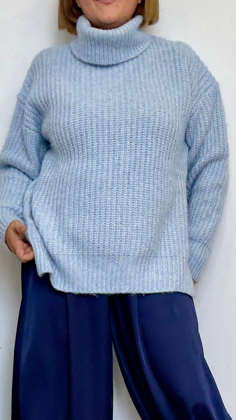 Suéter de cuello vuelto azul bebé amplio y gustosito.