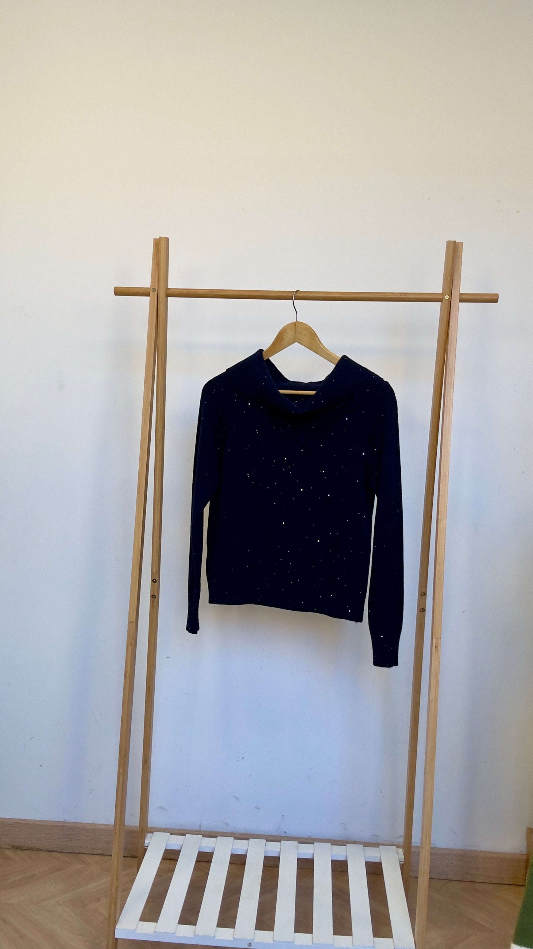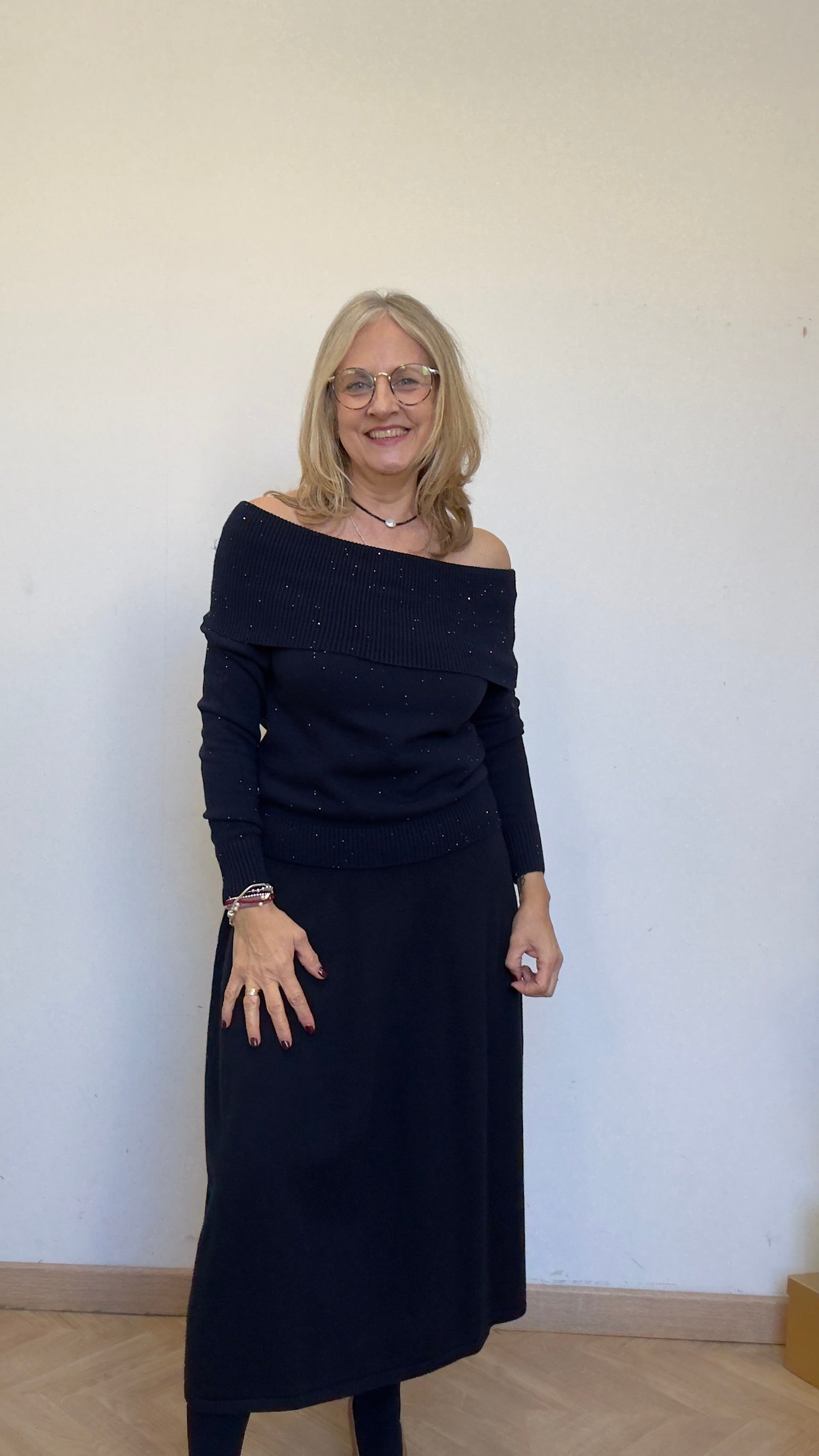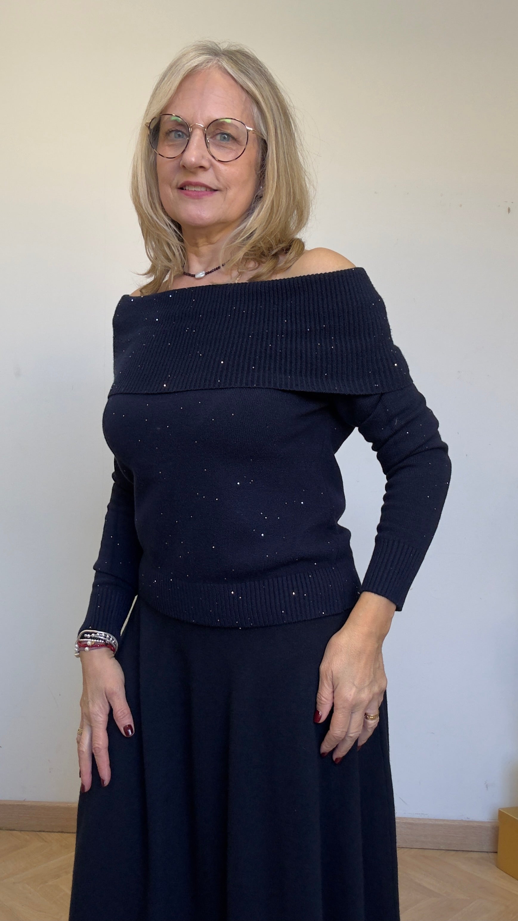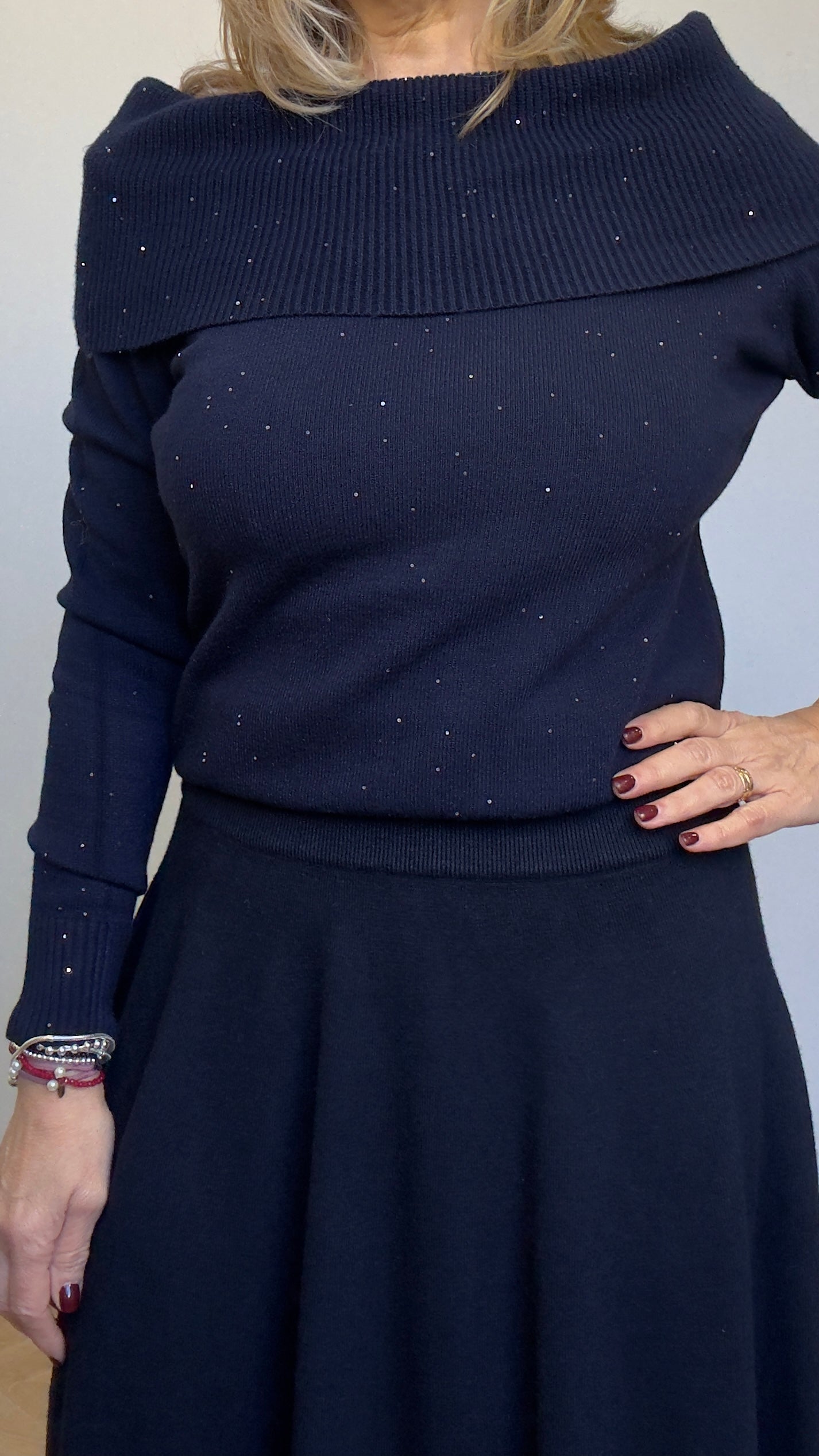 Suéter de escote bardot, ideal en punto azul marino, con brilli.