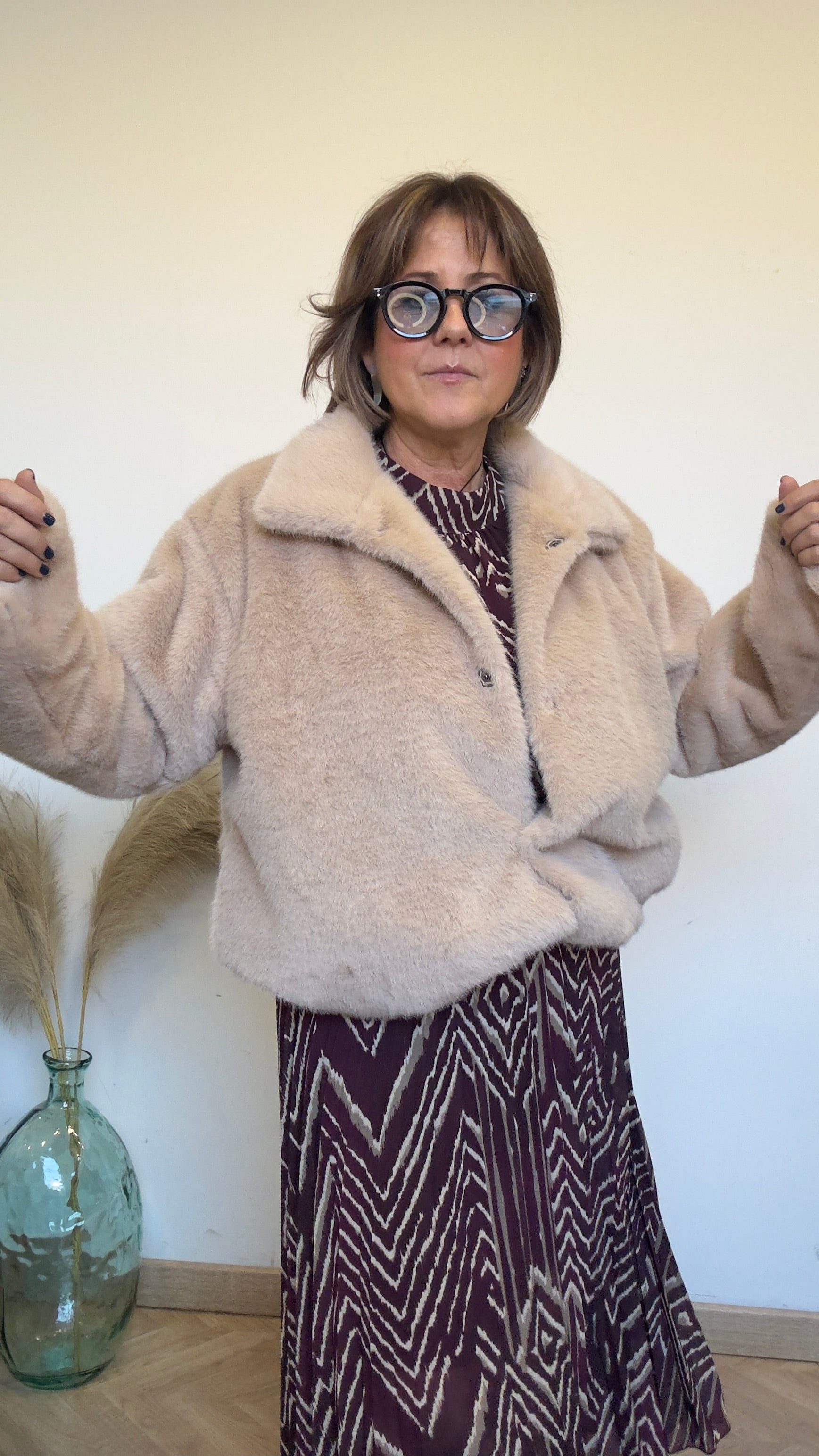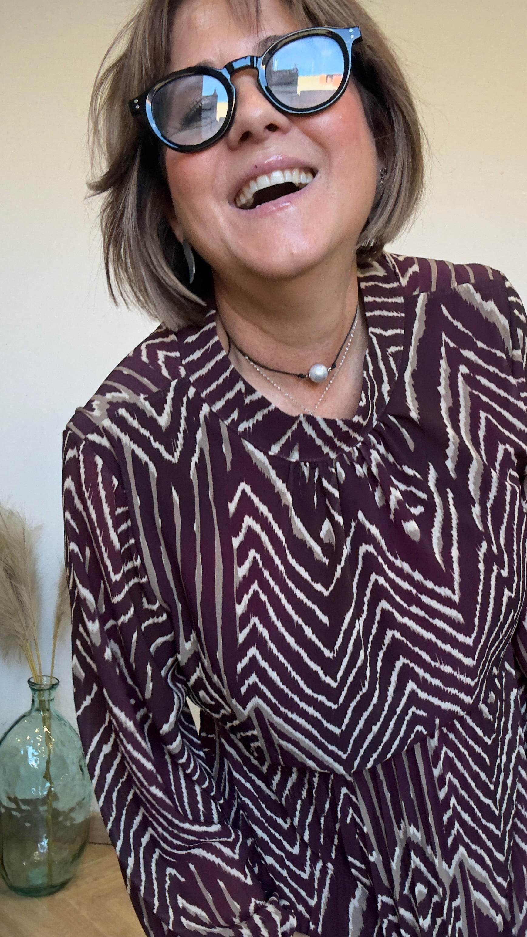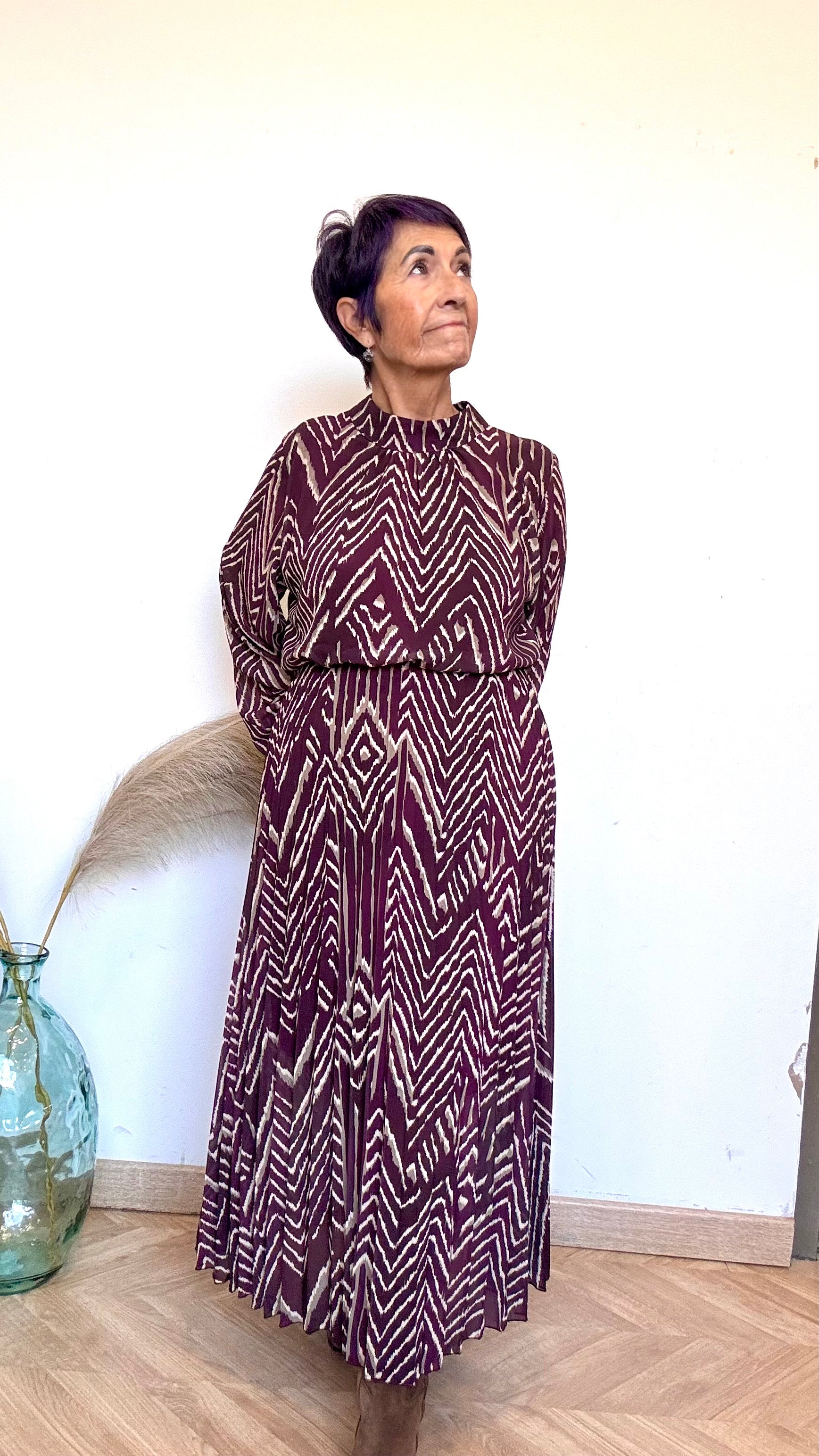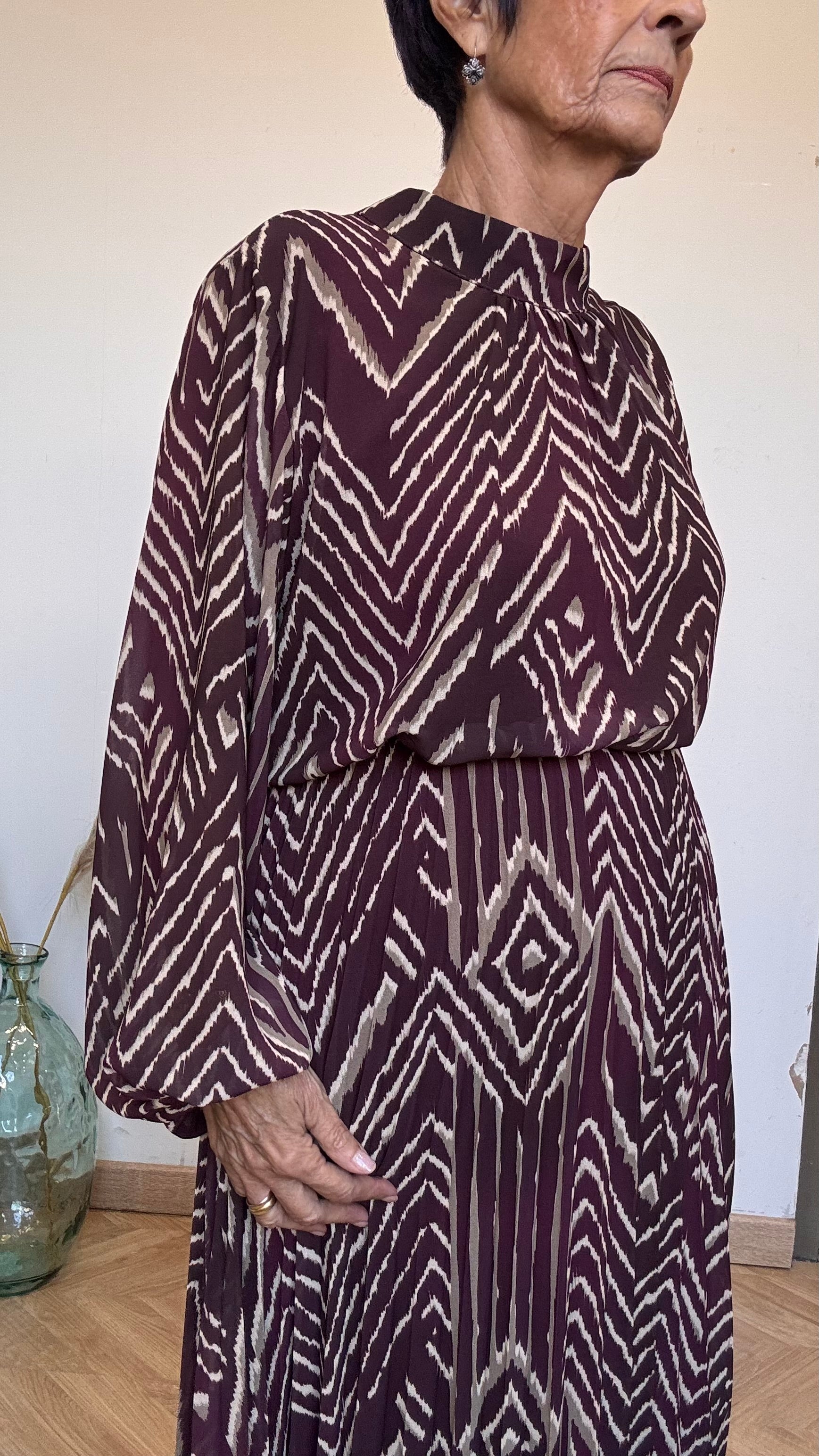 Vestido plisado de gasa vaporosa en burdeos y arena.